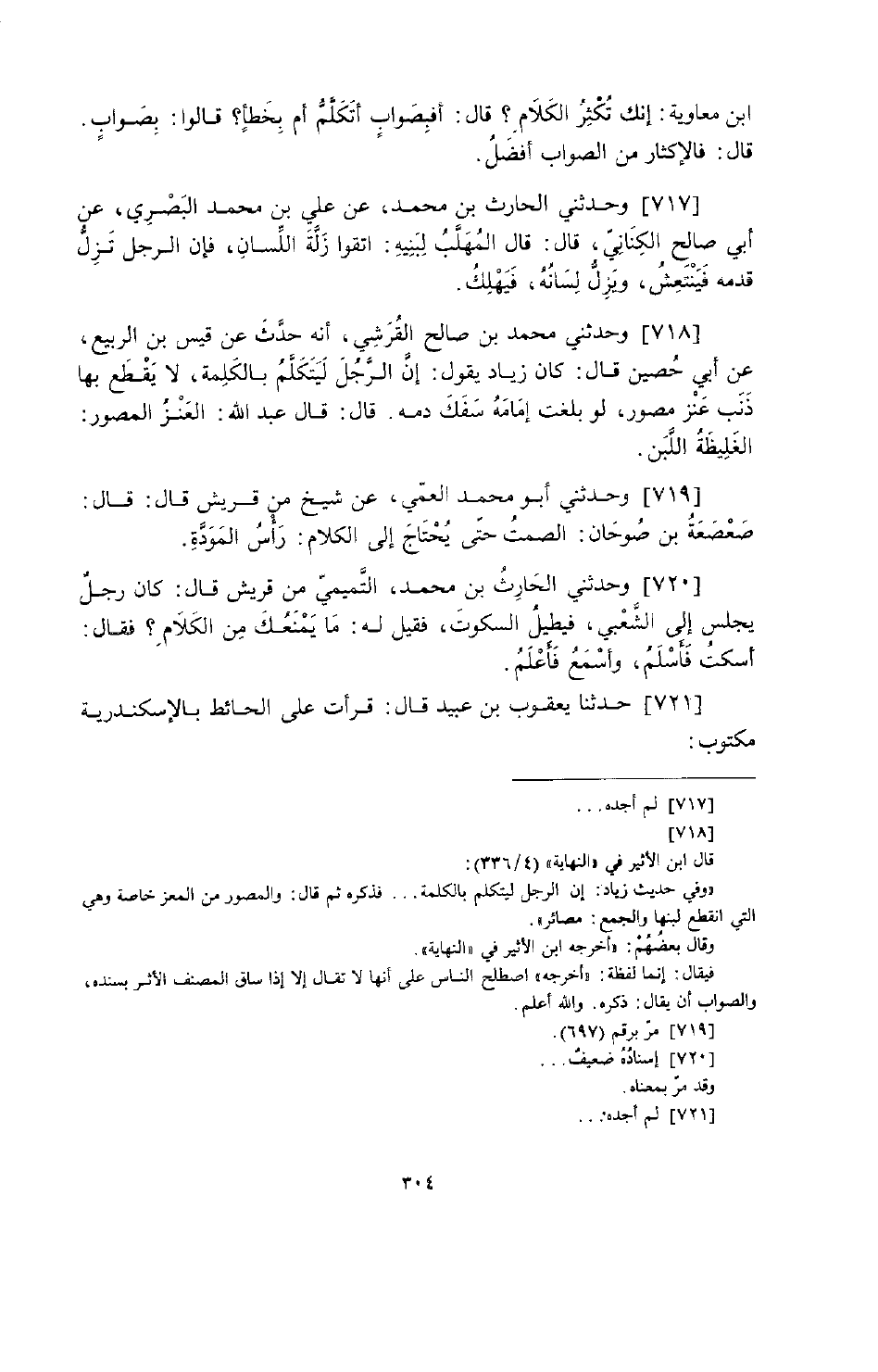 719 - وَحَدَّثَنِي أَبُو مُحَمَّدٍ الْعَمِّيُّ، عَنْ شَيْخٍ، مِنْ قُرَيْشٍ قَالَ: قَالَ صَعْصَعَةُ بْنُ صُوحَانَ: «§الصَّمْتُ حَتَّى يُحْتَاجَ إِلَى الْكَلَامِ رَأْسُ الْمُرُوءَةِ»