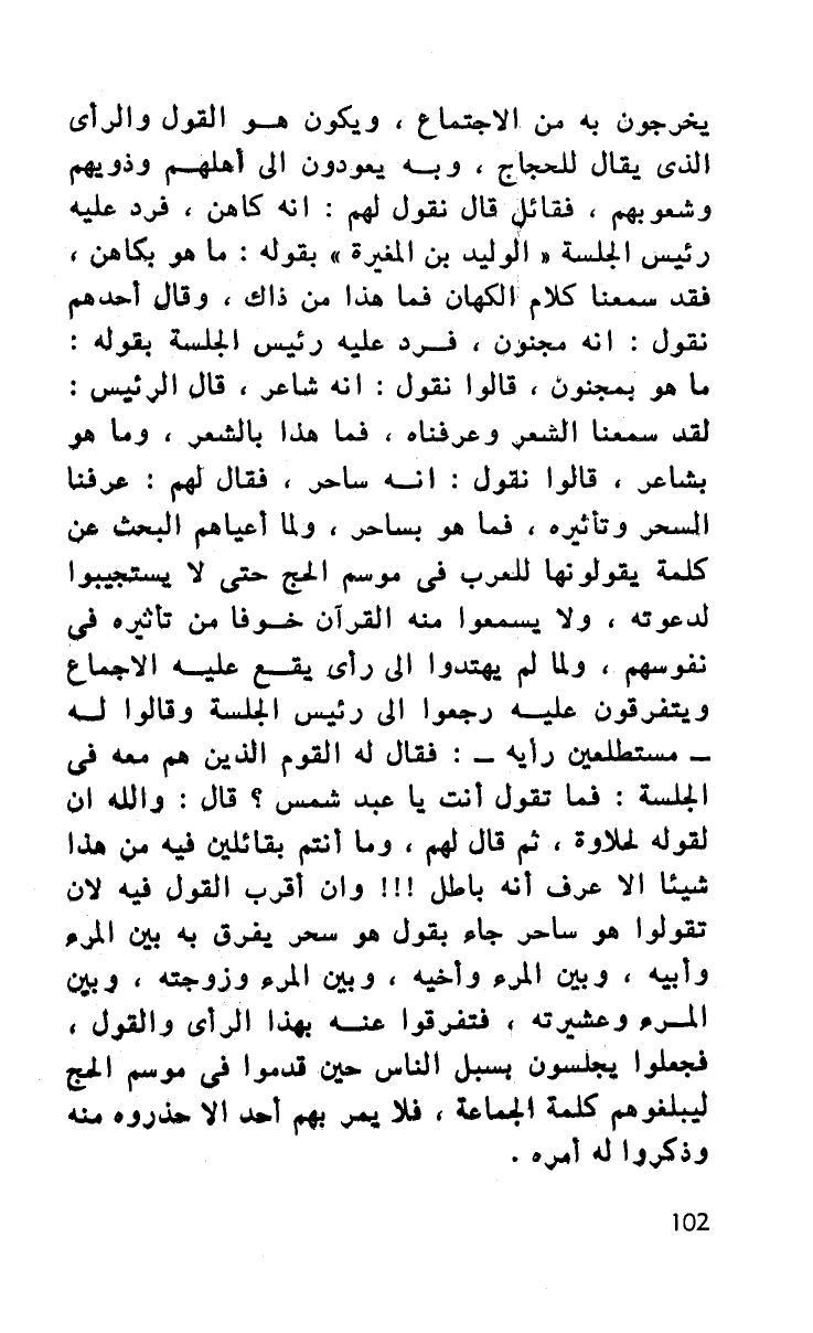 يخرجون به من الاجتماع، وكون هو القول والرأي الذي يقال للحجاج، وبه يعودون إلى أهلهم وذويهم وشعوبهم فقائل قال نقول لهم إنه كاهن فرد عليه رئيس الجلسة ((الوليد بن المغيرة)) بقوله ما هو بكاهن، فقد سمعنا كلام الكهان فما هذا من ذاك، وقال أحدهم نقول إنه مجنون فرد عليه رئيس الجلسة بقوله ما هو بمجنون، قالوا نقول إنه شاعر، قال الرئيس لقد سمعنا الشعر وعرفناه، فما هذا بالشعر، وما هو بشاعر، قالوا نقول إنه ساحر فقال لهم عرفنا السحر وتأثيره، فما هو بساحر، ولما أعياهم البحث عن كلمة يقولونها للعرب في موسم الحج حتى لا يستجيبوا لدعوته، ولا يسمعوا منه القرآن خوفا من تأثيره في نفوسهم ولما لم يهتدوا إلى رأي يقع عليه الإجماع ويتفرقون عليه رجعوا إلى رئيس الجلسة وقالوا له - مستطلعين رأيه - فقال له القوم الذين هم معه في الجلسة فما تقول أنت يا عبد شمس؟ قال والله إن لقوله لحلاوة، ثم قال لهم، وما أنتم بقائلين فيه من هذا شيئا إلا عرف أنه باطل!!! وأن أقرب القول فيه لأن تقولوا هو ساحر جاء بقول هو سحر يفرق به بين المرء وأبيه وبين المرء وأخيه وبين المرء وزوجته وبين المرء وعشيرته، فتفرقوا عنه بهذا الرأي والقول، فجعلوا يجلسون بسبل الناس حتى قدموا في موسم الحج ليبلغوهم كلمة الجماعة، فلا يمر بهم أحد إلا حذروه منه وذكروا له أمره.