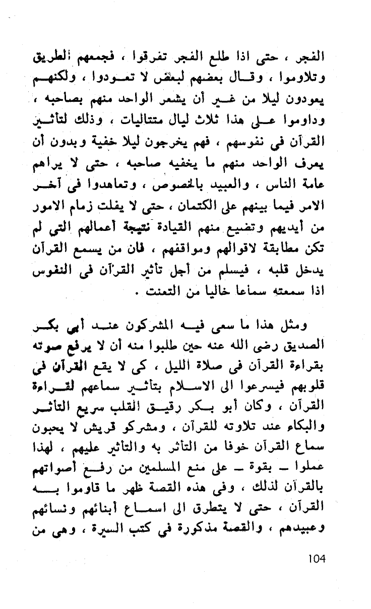 الفجر، حتى إذا طلع الفجر تفرقوا، فجمعهم الطريق وتلاوموا، وقال بعضهم لبعض لا تعودوا، ولكنهم يعودون ليلا من غير أن يشعر الواحد منهم بصاحبه، وداوموا على هذا ثلاث ليال متتاليات، وذلك لتأثير القرآن في نفوسهم، فهم يخرجون ليلا خفية وبدون أن يعرف الواحد منهم ما يخفيه صاحبه، حتى لا يراهم عامة الناس والعبيد بالخصوص، وتعاهدوا في آخر الأمر فيما بينهم على الكتمان، حتى لا يفلت زمام الأمور من أيديهم وتضيع منهم القيادة نتيجة أعمالهم التي لم تكن مطابقة لأقوالهم ومواقفهم، فإن من يسمع القرآن يدخل قلبه، فيسلم من أجل تأثير القرآن في النفوس إذا سمعته سماعا خاليا من التعنت.