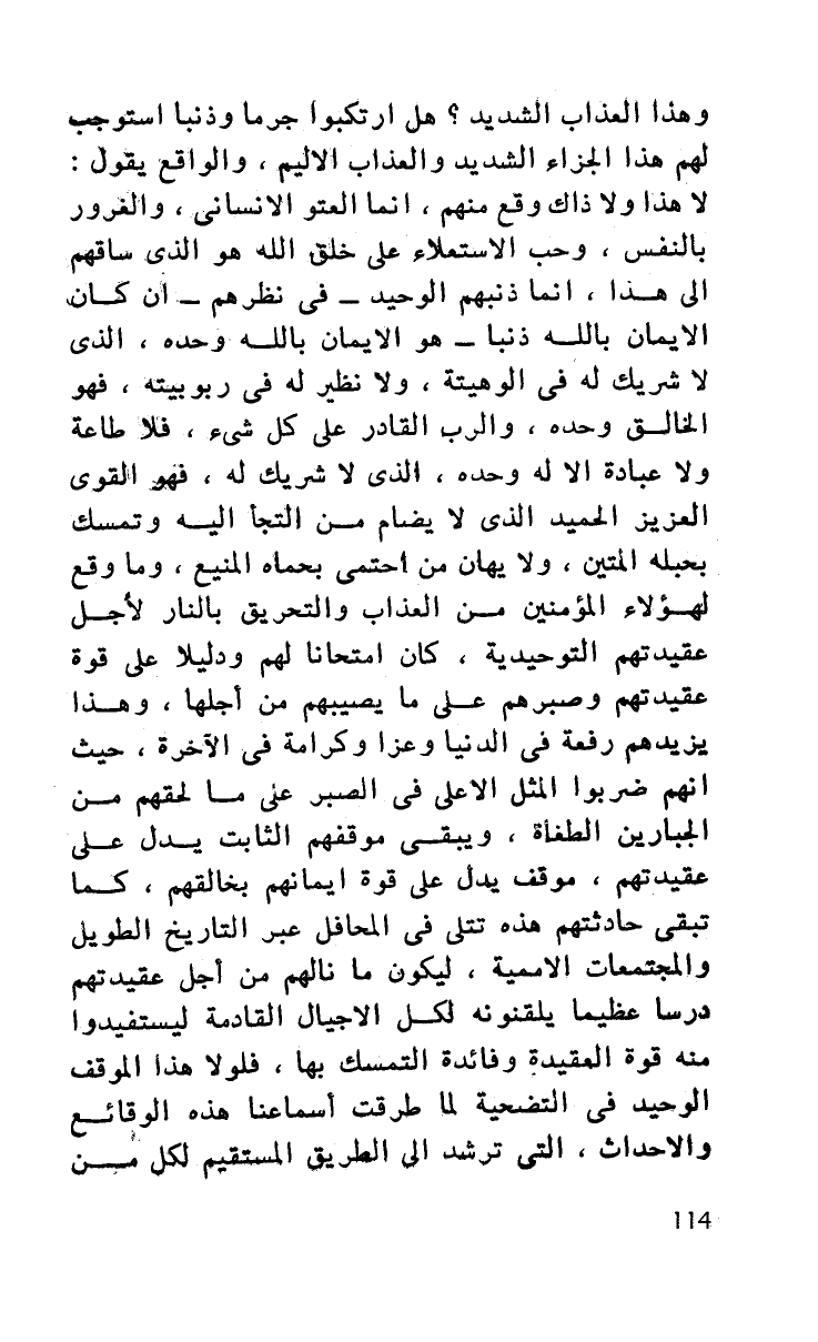 وهذا العذاب الشديد؟ هل ارتكبوا جرما وذنبا استوجب لهم هذا الجزاء الشديد والعذاب الأليم، والواقع يقول لا هذا ولا ذاك وقع منهم، إنما العتو الإنساني، والغرور بالنفس، وحب الاستعلاء على خلق الله هو الذي ساقهم إلى هذا، إنما ذنبهم الوحيد - في نظرهم - إن كان الإيمان بالله ذنبا - هو الإيمان بالله وحده، الذي لا شريك له في ألوهيته، ولا نظير له في ربوبيته فهو الخالق وحده، والرب القادر على كل شيء، فلا طاعة ولا عبادة إلا له وحده، الذي لا شريك له فهو القوي العزيز الحميد الذي لا يضام من التجأ إليه وتمسك بحبله المتين، ولا يهان من احتمى بحماه المنيع، وما وقع لهؤلاء المؤمنين من العذاب والتحريق بالنار لأجل عقيدتهم التوحيدية، كان امتحانا لهم ودليلا على قوة عقيدتهم وصبرهم على ما يصيبهم من أجلها، وهذا يزيدهم رفعة في الدنيا وعزا وكرامة في الآخرة، حيث أنهم ضربوا المثل الأعلى في الصبر على ما لحقهم من الجبارين الطغاة، ويبقى موقفهم الثابت يدل على عقيدتهم موقف يدل على قوة إيمانهم بخالقهم، كما تبقى حادثتهم هذه تتلى في المحافل عبر التاريخ الطويل والمجتمعات الأممية، ليكون ما نالهم من أجل عقيدتهم درسا عظيما يلقنونه لكل الأجيال القادمة ليستفيدوا منه قوة العقيدة وفائدة التمسك بها، فلولا هذا الموقف الوحيد في التضحية لما طرقت أسماعنا هذه الوقائع والأحداث، التي ترشد إلى الطريق المستقيم لكل من