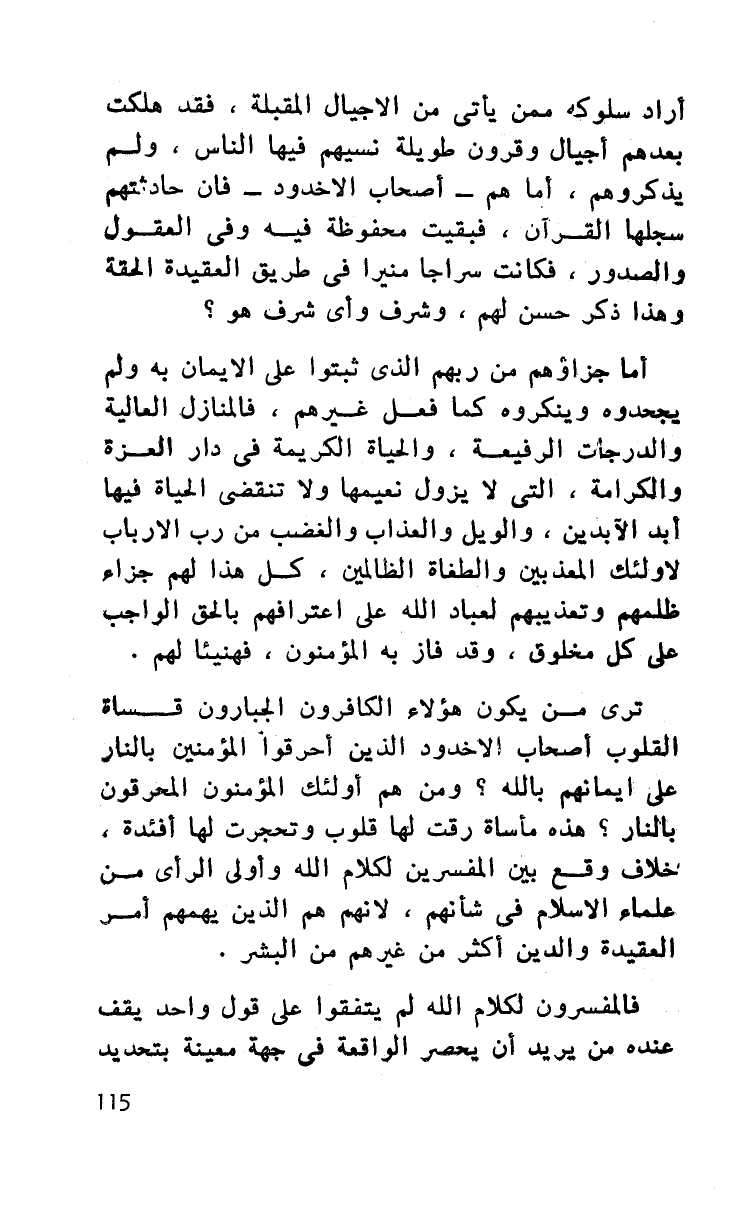 أراد سلوكه ممن يأتي من الأجيال المقبلة فقد هلكت بعدهم أجيال وقرون طويلة نسيهم فيها الناس، ولم يذكروهم، أما هم - أصحاب الأخدود - فإن حادثتهم سجلها القرآن، فبقيت محفوظة فيه وفي العقول والصدور، فكانت سراجا منيرا في طريق العقيد ة الحقة وهذا ذكر حسن لهم، وشرف وأي شرف هو؟