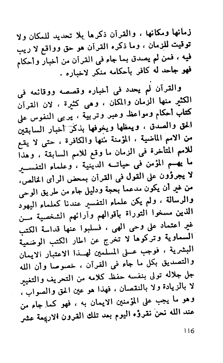 والقرآن لم يحدد في أخباره وقصصه ووقائعه في الكثير منها الزمان والمكان، وهي كثيرة، لأن القرآن كتاب أحكام ومواعظ وعبر وتربية، يربي النفوس على الحق والصدق، ويعظها ويخوفها بذكر أخبار السابقين من الأمم الماضية، المؤمنة منها والكافرة، حتى لا يقع للأمم المتأخرة في الزمان ما وقع للأمم السابقة، وهذا ما يهم المؤمن في حياته الدينية، وعلماء التفسير لا يجرؤون على القول في القرآن بمحض الرأي الخالص، من غير أن يكون مدعما بحجة ودليل جاء من طريق الوحي والرسالة، ولم يكن علماء التفسير عندنا كعلماء اليهود الذين مسخوا التوراة بأقوالهم وآرائهم الشخصية من غير اعتماد على وحي إلهي، فسلبوا عنها قداسة الكتب السماوية وتركوها لا تخرج عن إطار الكتب الوضعية البشرية، فوجب على المسلمين لهذا الاعتبار الإيمان والتصديق بكل ما جاء في القرآن، خصوصا وأن الله جل جلاله تولى بنفسه حفظ كلامه من التحريف والتغيير لا بالزيادة ولا بالنقصان، فهذا هو عين الحق والصواب، وهو ما يجب على المؤمنين الإيمان به فهو كما جاء من عند الله نحن نقرؤه اليوم بعد تلك القرون الأربعة عشر