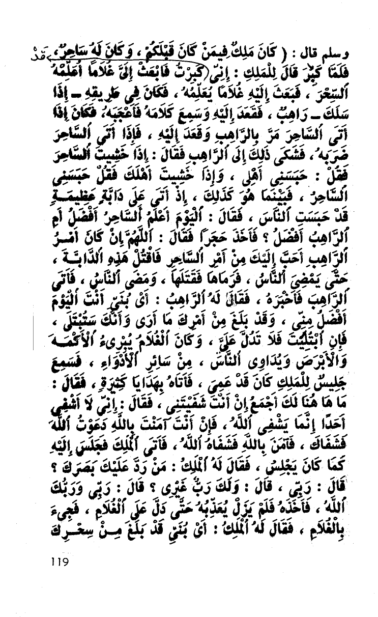 وسلم قال: (كان ملك فيمن كان قبلكم، وكان له ساحر، فلما كبر قال للملك: إني قد كبرت فابعث إلي غلاما أعلمه السحر، فبعث إليه غلاما يعلمه، فكان في طريقه - إذا سلك - راهب، فقعد إليه وسمع كلامه فأعجبه، فكان إذا أتى الساحر مرة بالراهب وقعد إليه، فإذا أتى الساحر ضربه، فشكى ذلك إلى الراهب فقال: إذا خشيت الساحر فقل: حبسني أهلي، وإذا خشيت أهلك فقل حبسني الساحر، فبينما هو كذلك، إذ أتى على دابة عظيمة قد حبست الناس، فقال: اليوم أعلم الساحر أفضل أم الراهب أفضل؟ فأخذ حجرا فقل: اللهم إن كان أمر الراهب أحب إليك من أمر الساحر فاقتل هذه الدابة، حتى يمضي الناس، فرماها فقتلها، ومضى الناس، فأتى الراهب فأخبره، فقال له الراهب: أي بني أنت اليوم أفضل مني، وقد بلغ من أمرك ما أرى وأنك ستبتلى، فإن ابتليت فلا تدل علي، وكان الغلام يبرئ الأكمه والأبرص ويدوي الناس، من سائر الأدواء، فسمع جليس للملك كان قد عمي، فأتاه بهدايا كثيرة، فقال: ما ها هنا لك أجمع إن أنت شفيتني، فقال: إني لا أشفي أحدا إنما يشفي الله، فإن أنت آمنت بالله دعوت الله فشفاك، فآمن بالله فشفاه الله، فأتى الملك فجلس إليه كما كان يجلس، فقال له الملك: من رد عليك بصرك؟ قال: ربي، قال: ولك رب غيري؟ قال: ربي وربك الله، فأخذه لفم يزل يعذبه حتى دل على الغلام، فجيء بالغلام، فقال له الملك: أي بني قد بلغ من سحرك