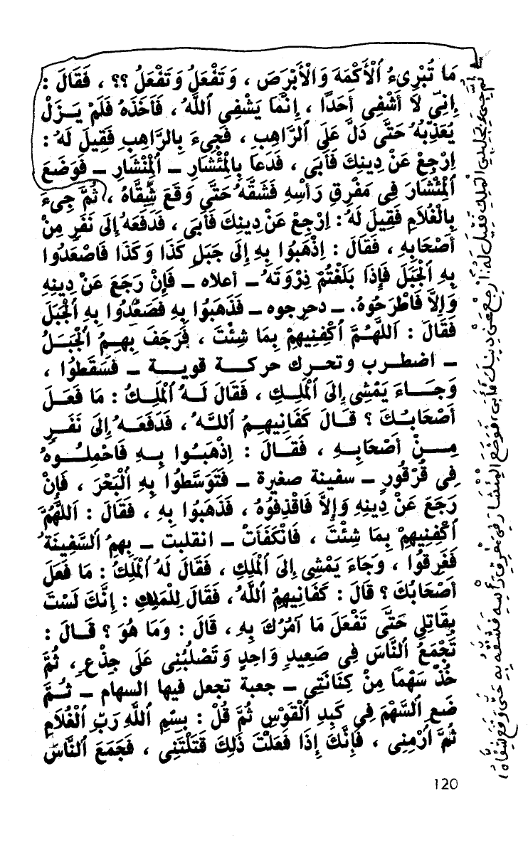 ما تبرئ الأكمه والأبرص، وتفعل وتفعل؟؟، فقال: إني لا أشقى أحدا، إنما يشفي الله، فأخذه فلم يزل يعذبه حتى دل على الراهب، فجيء بالراهب فقيل له: ارجع عن دينك فأبى، فدعا بالمئشار - المنشار - فوضع المئشار في مفرق رأس فشقه حتى وقع شقاه، ثم جيء بالغلام فقيل له: ارجع عن دينك فأبى، فدفعه إلى نفر من أصحابه، فقال: اذهبوا به إلى جبل كذا وكذا فاصعدوا به الجبل فإذا بلغتم ذروته - أعلاه - فإن رجع عن دينه وإلا فاطرحوه - دحرجوه - فذهبوا به فصعدوا به الجبل فقال: اللهم اكفنيهم بما شئت، فرجف بهم الجبل - اضطرب وتحرك حركة قوية - فسقطوا، وجاء يمشي إلى الملك، فقال له الملك: ما فعل أصحابك؟ قال كفانيهم الله، فدفعه إلى نفر من أصحابه، فقال: اذهبوا به فاحملوه في قرقور- سفينة صغيرة - فتوسطوا به البحر، فإن رجع عن دينه وإلا فاقذفوه، فذهبوا به، فقال: اللهم اكفنيهم بما شئت، فانكفأت - انقلبت - بهم السفينة فغرقوا، وجاء يمشي إلى الملك، فقال له الملك: ما فعل أصحابك؟ قال: كفانيهم الله، فقال للملك: إنك لست بقاتلي حتى تفعل ما آمرك به، قال: وما هو؟ قال: تجمع الناس في صعيد واحد وتصلبني على جذع، ثم خذ سهما من كنانتي - جعبة تجعل فيها السهام - ثم ضع السهم في كبد القوس ثم قل: بسم الله رب الغلام ثم ارمني، فإنك إذا فعلت ذلك قتلتني، فجمع الناس