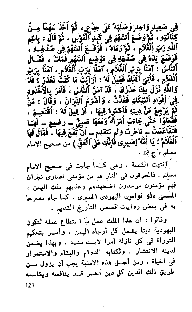 انتهت القصة، وهي كما جاءت في صحيح الإمام مسلم، فالمحرقون في النار هم من مؤمني نصارى نجران فهم مؤمنون موحدون اضطهدهم وعذبهم ملك اليمن، المسمى ((ذو نواس)) اليهودي الحميري، كما جاء مصرحا به في بعض روايات قصص التاريخ القديم.