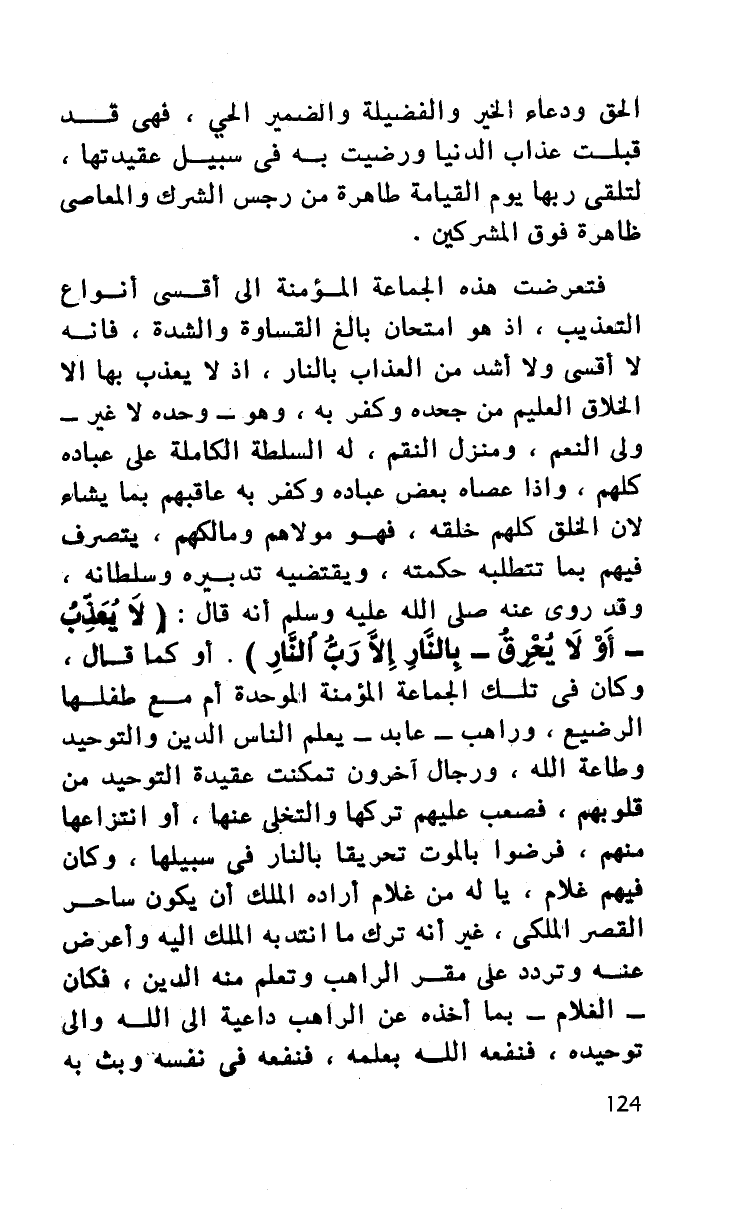 فتعرضت هذه الجماعة المؤمنة إلى أقسى أنواع التعذيب، إذ هو امتحان بالغ القساوة والشدة، فإنه لا أقسى ولا أشد من العذاب بالنار، إذ لا يعذب بها إلا الخلاق العليم من جحده وكفر به، وهو - وحده لا غير - ولي النعم، ومنزل النقم، له السلطة الكاملة على عباده كلهم، وإذا عصاه بعض عباده وكفر به عاقبهم بما يشاء لأن الخلق كلهم خلقه، فهو مولاهم ومالكهم، يتصرف فيهم بما تتطلبه حكمته، ويقتضيه تدميره وسلطانه، وقد روى عنه صلى الله عليه وسلم أنه قال: (لا يعذب - أو لا يحرق - بالنار إلا رب النار) أو كما قال، وكان في تلك الجماعة المؤمنة الموحدة أم مع طفلها الرضيع، وراهب - عابك - يعلم الناس الدين والتوحيد وطاعة الله، ورجال آخرون تمكنت عقيدة التوحيد من قلوبهم، فصعب عليهم تركها والتخلي عنها، أو انتزاعها منهم، فرضوا بالموت تحريقا بالنار في سبيلها، وكان فيهم غلام، يا له من غلام أراده الملك أن يكون ساحر القصر الملكي، غير أنه ترك ما انتدبه الملك إليه وأعرض عنه وتردد على مقر الراهب وتعلم منه الدين، فكان - الغلام - بما أخذه عن الراهب داعية إلى الله وإلى توحيده، فنفعه الله بعلمه، فنفعه في نفسه وبث به