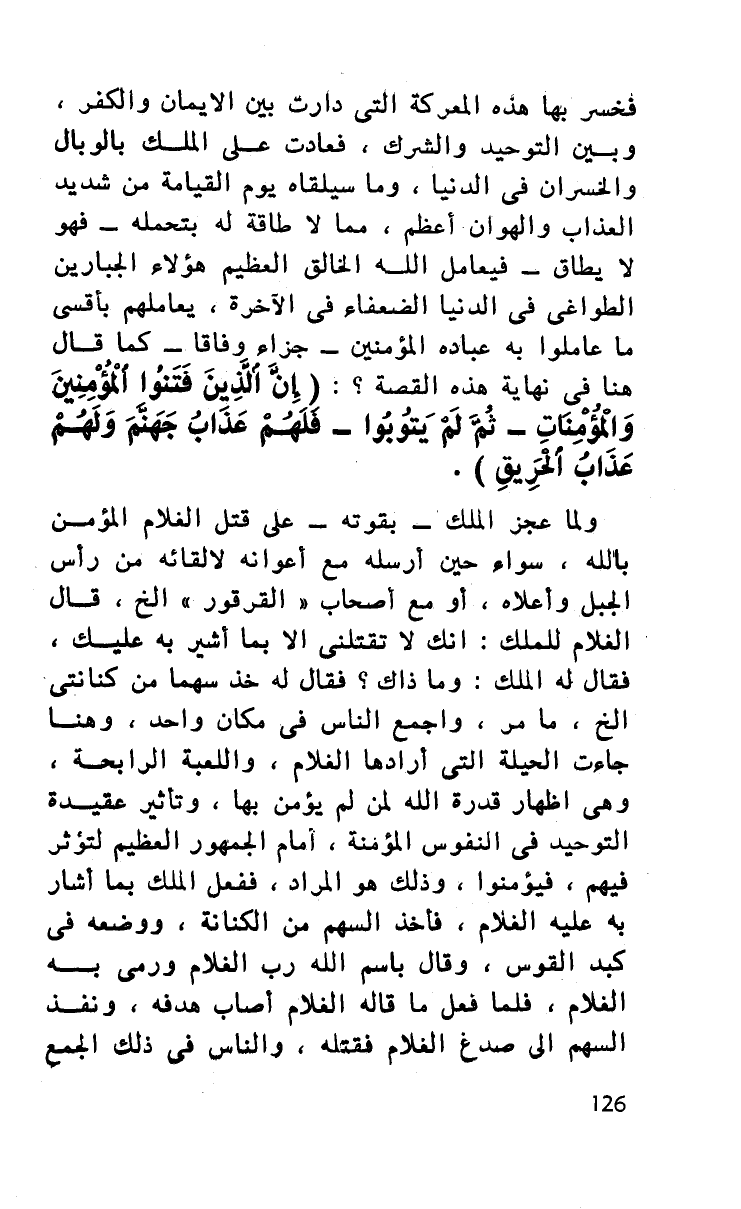 ولما عجز الملك - بقوته - على قتل الغلام المؤمن بالله، سواء حين أرسله مع أعوانه لإلقائه من رأس الجبل وأعلاه، أو مع أصحاب ((القرقور)) الخ، قال الغلام للملك، إنك لا تقتلني إلا بما أشير به عليك فقال له الملك: وما ذاك؟ فقال له خذ سهما من كنانتي الخ، ما مر، واجمع الناس في مكان واحد، وهنا جاءت الحيلة التي أرادها الغلام واللعبة الرابحة وهي إظهار قدرة الله لمن لم يؤمن بها، وتأثير عقيدة التوحيد في النفوس المؤمنة، أمام الجمهور العظيم لتؤثر فيهم فيؤمنوا، وذلك هو المراد، ففعل الملك بما أشار به عليه الغلام فأخذ السهم من الكنانة ووضعه في كبد القوس وقال باسم الله رب الغلام ورمى به الغلام فلما فعل ما قاله الغلام أصاب هدفه ونفذ السهم إلى صدغ الغلام فقتله، والناس في ذلك الجمع