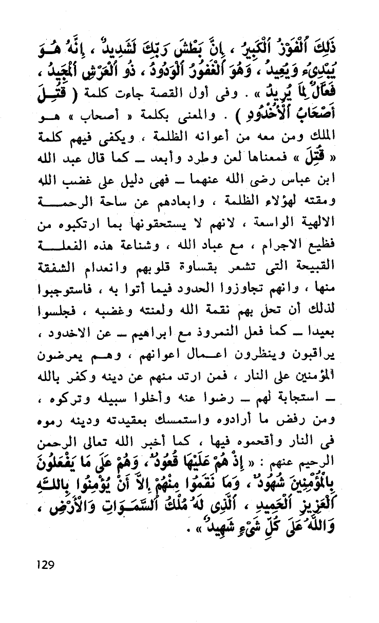 ذلك الفوز الكبير إن بطش ربك لشديد إنه هو يبدئ ويعيد وهو الغفور الودود ذو العرش المجيد فعال لما يريد)) وفي أول القصة جاءت كلمة (قتل أصحاب الأخدود) والمعنى بكلمة ((أصحاب)) هو الملك ومن معه من أعوانه الظلمة، ويكفي فيهم كلمة ((قتل)) فمعناها لعن وطرد وأبعد - كما قال عبد الله ابن عباس رضي الله عنهما - فهي دليل على غضب الله ومقته لهؤلاء الظلمة، وإبعادهم عن ساحة الرحمة الإلهية الواسعة، لأنهم لا يستحقونها بما ارتكبوه من فظيع الإجرام، مع عباد الله، وشناعة هذه الفعلة القبيحة التي تشعر بقساوة قلوبهم وانعدام الشفقة منها وأنهم تجاوزوا الحدود فيما أتوا به، فاستوجبوا لذلك أن تحل بهم نقمة الله ولعنته وغضبه، فجلسوا بعيدا - كما فعل النمرود مع إبراهيم - عن الأخدود يراقبون وينظرون أعمال أعوانهم وهم يعرضون المؤمنين على النار، فمن ارتد منهم عن دينه وكفر بالله - استجابة لهم - رضوا عنه وأحلوا سبيله وتركوه ومن رفض ما أرادوه واستمسك بعقيدته ودينه رموه في النار وأقحموه فيها، كما أخبر الله تعالى الرحمن الرحيم عنهم ((إذ هم عليها قعود وهم على ما يفعلون بالمؤمنين شهود وما نقموا منهم إلا أن يؤمنوا بالله العزيز الحميد الذي له ملك السموات والأرض والله على كل شيء شهيد)).