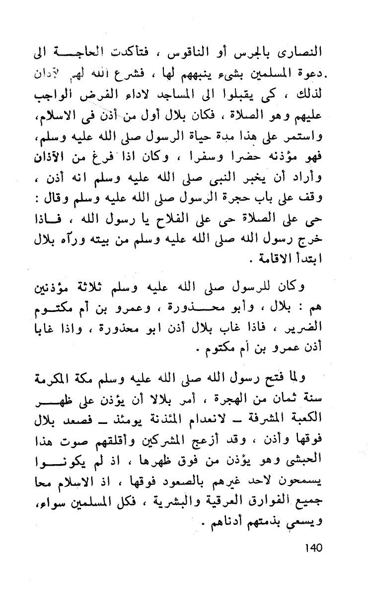 النصارى بالجرس أو الناقوس، فتأكدت الحاجة إلى دعوة المسلمين بشيء ينبههم لها، فشرع الله لهم الآذان لذلك، كي يقبلوا إلى المساجد لأداء الفرض الواجب عليهم وهو الصلاة، فكان بلال أول من أذن في الإسلام، واستمر على هذا مدة حياة الرسول صلى الله عليه وسلم، فهو مؤذنه حضرا وسفرا وكان إذا فرغ من الآذان وأراد أن يخبر النبي صلى الله عليه وسلم أنه أذن، وقف على باب حجرة الرسول صلى الله عليه وسلم وقال حي على الصلاة حي على الفلاح يا رسول الله، فإذا خرج رسول الله صلى الله عليه وسلم من بيته ورآه بلال ابتدأ الإقامة.