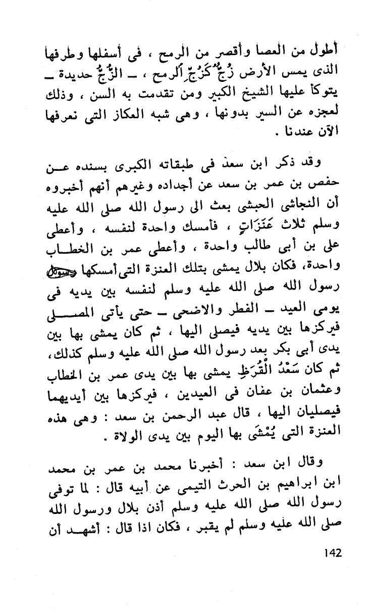 وقد ذكر ابن سعد في طبقاته الكبرى بسنده عن حفص بن عمر بن سعد عن أجداده وغيرهم أنهم أخبروه أن النجاشي الحبشي بعث إلى رسول الله صلى الله عليه وسلم ثلاث عنزات، فأمسك واحدة لنفسه، وأعطى علي بن أبي طالب واحدة، وأعطى عمر بن الخطاب واحدة، فكان بلال يمشي بتلك العنزة التي أمسكها رسول الله صلى الله عليه وسلم لنفسه بين يديه في يومي العيد - الفطر والأضحى - حتى يأتي المصلى فيركزها بين يديه فيصلي إليها ثم كان يمشي بها بين يدي أبي بكر بعد رسول الله صلى الله عليه وسلم كذلك، ثم كان سعد القرظ يمشي بها بين يدي عمر بن الخطاب وعثمان بن عفان في العيدين، فيركزها بين أيديهما فيصليان إليها، قال عبد الرحمن بن سعد، وهي هذه العنزة التي يمشى بها اليوم بين يدي الولاءة.