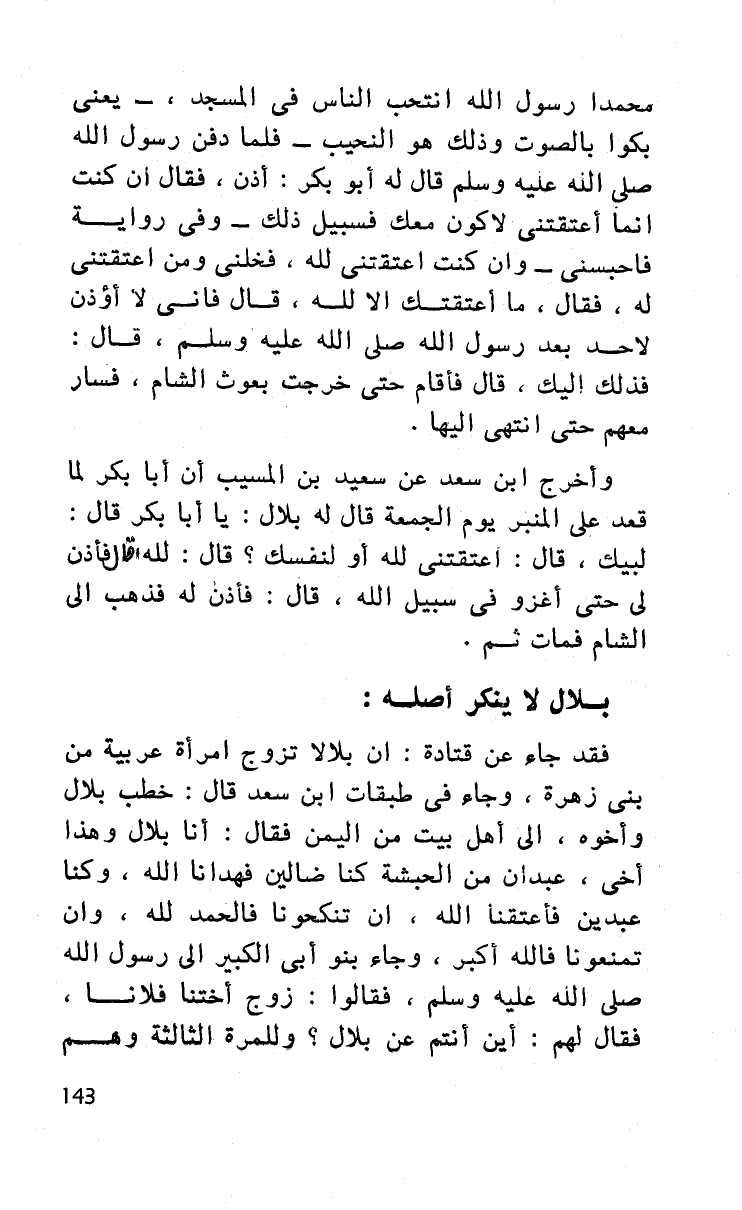 محمدا رسول الله انتحب الناس في المسجد - يعني بكوا بالصوت وذلك هو النحيب - فلما دفن رسول الله صلى الله عليه وسلم قال له أبو بكر: أذن، فقال إن كنت إنما أعتقتني لأكون معك فسبيل ذلك - وفي رواية فاحبسني - وإن كنت اعتقتني لله فخلني ومن اعتقتني له، فقال، ما اعتقتك إلا لله، قال فإني لا أؤذن لأحد بعد رسول الله صلى الله عليه وسلم، قال: فدلك إليك، قال فأقام حتى خرجت بعوث الشام فسار معهم حتى انتهى إليها.