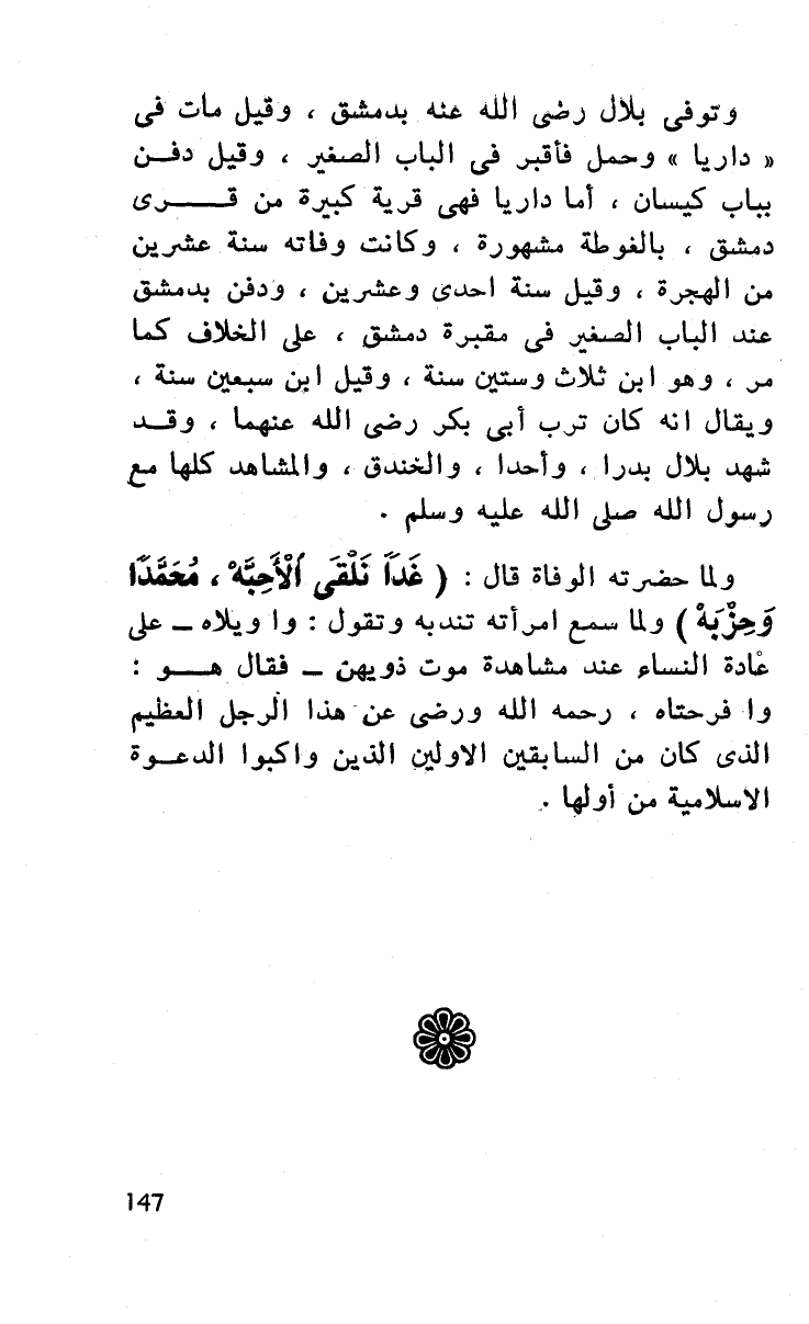 ولما حضرته الوفاة قال: (غدا نلقى الأحبه، محمدا وحزبه) ولما سمع امرأته تندبه وتقول: وا ويلاه - على عادة النساء عند مشاهدة موت ذويهن - فقال هو وافرحتاه، رحمه الله ورضي عن هذا الرجل العظيم الذي كان من السابقين الأولين الذين واكبوا الدعوة الإسلامية من أولها.