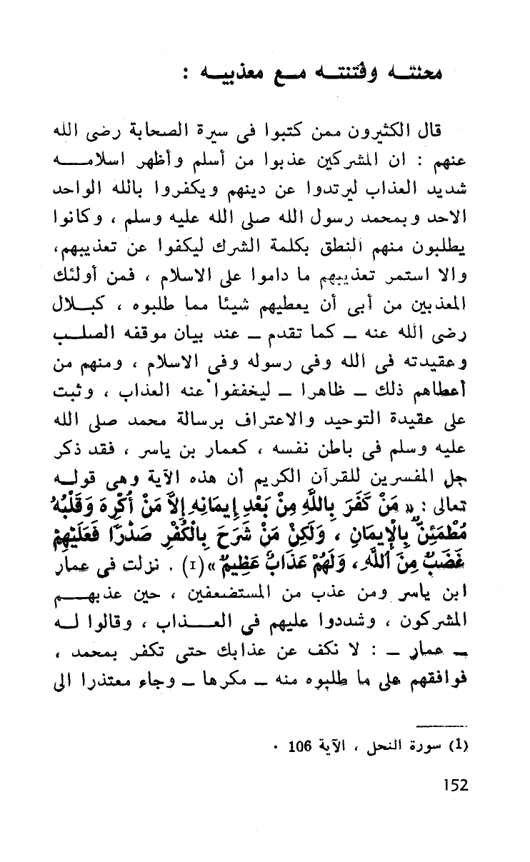 قال الكثيرون ممن كتبوا في سيرة الصحابة رضي الله عنهم: ان المشركين عذبوا من أسلم وأظهر إسلامه شديد العذاب ليرتدوا عن دينهم ويكفروا بالله الواحد الأحد وبمحمد رسول الله صلى الله عليه وسلم، وكانوا يطلبون منهم النطق بكلمة الشرك ليكفوا عن تعذيبهم، وإلا استمر تعذيبهم ما داموا على الإسلام، فمن أولئك المعذبين من أبى أن يعطيهم شيئا مما طلبوه كبلال رضي الله عنه - كما تقدم - عند بيان موقفه الصلب وعقيدته في الله وفي رسوله وفى الإسلام ومنهم من أعطاهم ذلك - ظاهرا - ليخففوا عنه العذاب، وثبت على عقيدة التوحيد والاعتراف برسالة محمد صلى الله عليه وسلم في باطن نفسه، كعمار بن ياسر، فقد ذكر جل المفسرين للقرآن الكريم أن هذه الآية وهي قوله تعالى: ((من كفر بالله من بعد إيمانه إلا من أكره وقلبه مطمئن بالإيمان ولكن من شرح بالكفر صدرا فعليهم غضب من الله ولهم عذاب عظيم)) (¬1) نزلت في عمار ابن ياسر ومن عذب من المستضعفين، حين عذبهم المشركون، وشددوا عليهم في العذاب، وقالوا له - عمار - لا نكف عن عذابك حتى تكفر بمحمد فوافقهم على ما طلبوه منه - مكرها - وجاء معتذرا إلى
