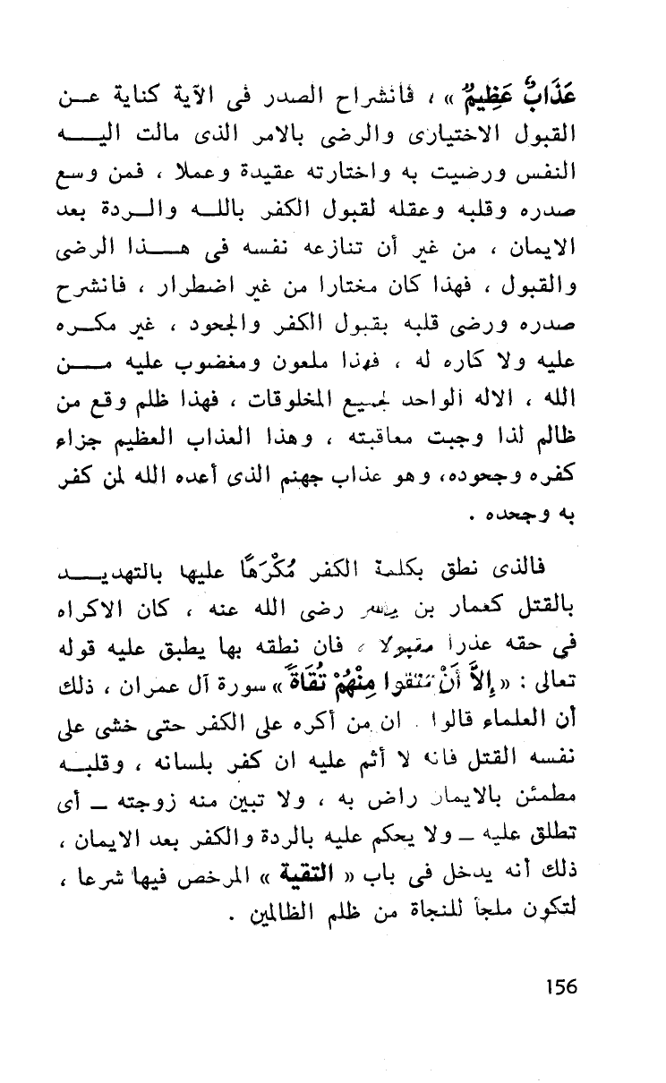 فالذي نطق بكلمة الكفر مكرها عليها بالتهديد بالقتل كعمار بن ياسر رضي الله عنه، كان الإكراه في حقه عذرا مقبولا، فإن نطقه بها يطبق عليه قوله تعالى: ((إلا أن تتقوا منهم تقاة)) سورة آل عمران، ذلك أن العلماء قالوا: أن من أكره على الكفر حتى خشي على نفسه القتل فإنه لا إثم عليه إن كفر بلسانه، وقلبه مطمئن بالإيمان راض به، ولا تبين منه زوجته - أي تطلق عليه - ولا يحكم عليه بالردة والكفر بعد الإيمان، ذلك أنه يدخل في باب ((التقية)) المرخص فيها شرعا، لتكون ملجأ للنجاة من ظلم الظالمين.