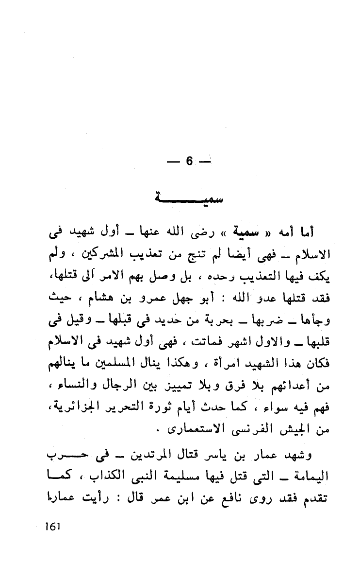 أما أمه ((سمية)) رضي الله عنها - أول شهيد في الإسلام - فهي أيضا لم تنج من تعذيب المشركين، ولم يكف فيها التعذيب وحده، بل وصل بهم الأمر إلى قتلها، فقد قتلها عدو الله، أبو جهل عمرو بن هشام حيث وجأها - ضربها - بحربة من حديد في قبلها - وقيل في قلبها - والأول أشهر فماتت، فهي أول شهيد في الإسلام فكان هذا الشهيد امرأة، وهكذا ينال المسلمين ما ينالهم من أعدائهم بلا فرق وبلا تمييز بين الرجال والنساء فهم فيه سواء، كما حدث أيام ثورة التحرير الجزائرية، من الجيش الفرنسي الاستعماري.
