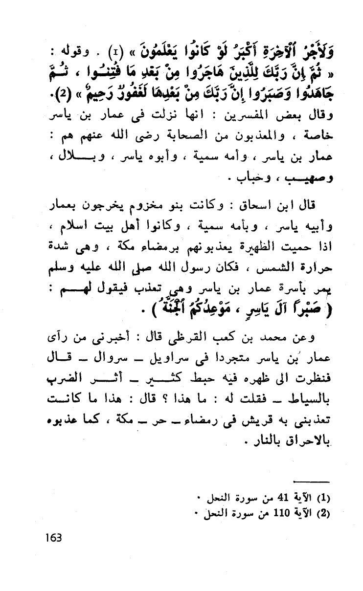 وقال بعض المفسرين، أنها نزلت في عمار بن ياسر خاصة، والمعذبون من الصحابة رضي الله عنهم هم عمار بن ياسر، وأمه سمية، وأبوه ياسر وبلال، وصهيب، وخباب.