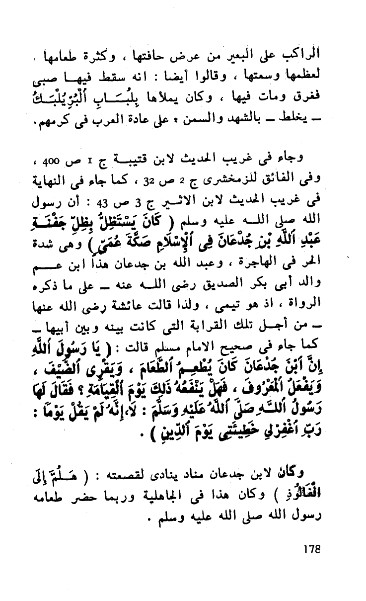 وجاء في غريب الحديث لابن قتيبة ج 1 ص 400، وفي الفائق للزمخشري ج 2 ص 32، كما جاء في النهاية في غريب الحديث لابن الأثير ج 3 ص 43، أن رسول الله صلى الله عليه وسلم (كان يستظل بظل جفنة عبد الله بن جدعان في الإسلام صكة عمي) وهي شدة الحر في الهاجرة، وعبد الله بن جدعان هذا ابن عم والد أبي بكر الصديق رضي الله عنه - على ما ذكره الرواة، إذ هو تيمي، ولذا قالت عائشة رضي الله عنها - من أجل تلك القرابة التي كانت بينه وبين أبيها - كما جاء في صحيح الإمام مسلم قالت: (يا رسول الله إن ابن جدعان كان يطعم الطعام، ويقري الضيف، ويفعل المعروف، فهل ينفعه ذلك يوم القيامة؟ فقال لها رسول الله صلى الله عليه وسلم: لا، إنه لم يقل يوما: رب أغفر لي خطيئتي يوم الدين).