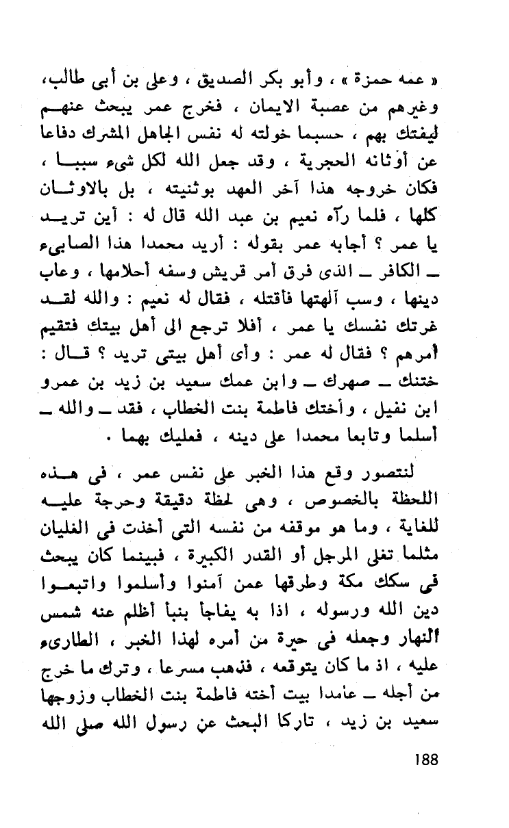 ((عمه حمزة))، وأبو بكر الصديق، وعلي بن أبي طالب، وغيرهم من عصبة الإيمان، فخرج عمر يبحث عنهم ليفتك بهم، حسبما خولته له نفس الجاهل المشرك دفاعا عن أوثانه الحجرية، وقد جعل الله لكل شيء سببا فكان خروجه هذا آخر العهد بوثنيته، بل بالأوثان كلها، فلما رآه نعيم بن عبد الله قال له: أين تريد يا عمر؟ أجابه عمر بقوله: أريد محمدا هذا الصابئ - الكافر - الذي فرق أمر قريش وسفه أحلامها وعاب دينها، وسب آلهتها فأقتله، فقال له نعيم: والله لقد غرتك نفسك يا عمر، أفلا ترجع إلى أهل بيتك فتقيم أمرهم؟ فقال له عمر: وأي أهل بيتي تريد؟ قال: ختنك - صهرك - وابن عمك سعيد بن زيد بن عمرو ابن نفيل، وأختك فاطمة بنت الخطاب، فقد - والله - أسلما وتابعا محمدا على دينه، فعليك بهما.