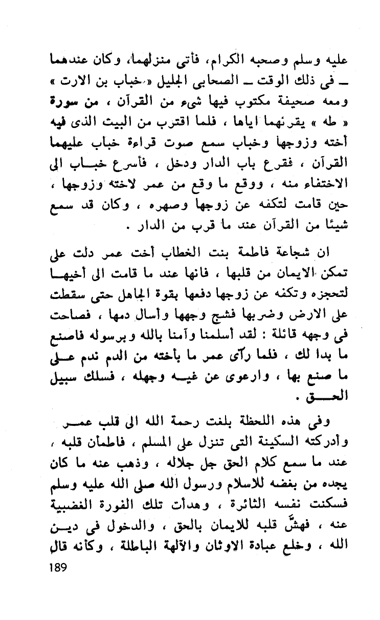 عليه وسلم وصحبه الكرام، فأتى منزلهما، وكان عندهما - في ذلك الوقت - الصحابي الجليل ((خباب بن الأرت)) ومعه صحيفة مكتوب فيها شيء من القرآن، من سورة ((طه)) يقرئهما إياها، فلما اقترب من البيت الذي فيه أخته وزوجها وخباب سمع صوت قراءة خباب عليهما القرآن، فقرع باب الدار ودخل، فأسرع خباب إلى الاختفاء منه، ووقع ما وقع من عمر لأخته وزوجها، حين قامت لتكفه عن زوجها وصهره، وكان قد سمع شيئا من القرآن عند ما قرب من الدار.
