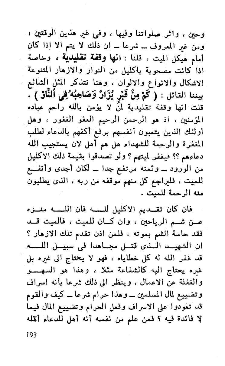 وحين، وإثر صلواتنا وفيها، وفي غير هذين الوقتين، ومن غير المعروف - شرعا - أن ذلك لا يتم إلا إذا كان أمام هيكل الميت، قلنا: إنها وقفة تقليدية، وخاصة إذا كانت مصحوبة بإكليل من النوار والأزهار المتنوعة الأشكال والأنواع والألوان، وهنا نتذكر المثل الشائع بيننا القائل (كم من قبر يزار وصاحبه في النار). قلت إنها وقفة تقليدية لمن لا يؤمن بالله راحم عباده المؤمنين، إذ هو الرحمن الرحيم العفو الغفور، وهل أولئك الذين يتعبون أنفسهم يرفع أكفهم بالدعاء لطلب المغفرة والرحمة للشهداء هل هم أهل لأن يستجيب الله دعاءهم؟؟ فيغفر لميتهم؟ ولو تصدقوا بقيمة ذلك الإكليل من الورود - وثمنه مرتفع جدا - لكان أجدى وأنفع للميت، فليراجع كل منهم موقفه من ربه، الذي يطلبون منه الرحمة للميت.