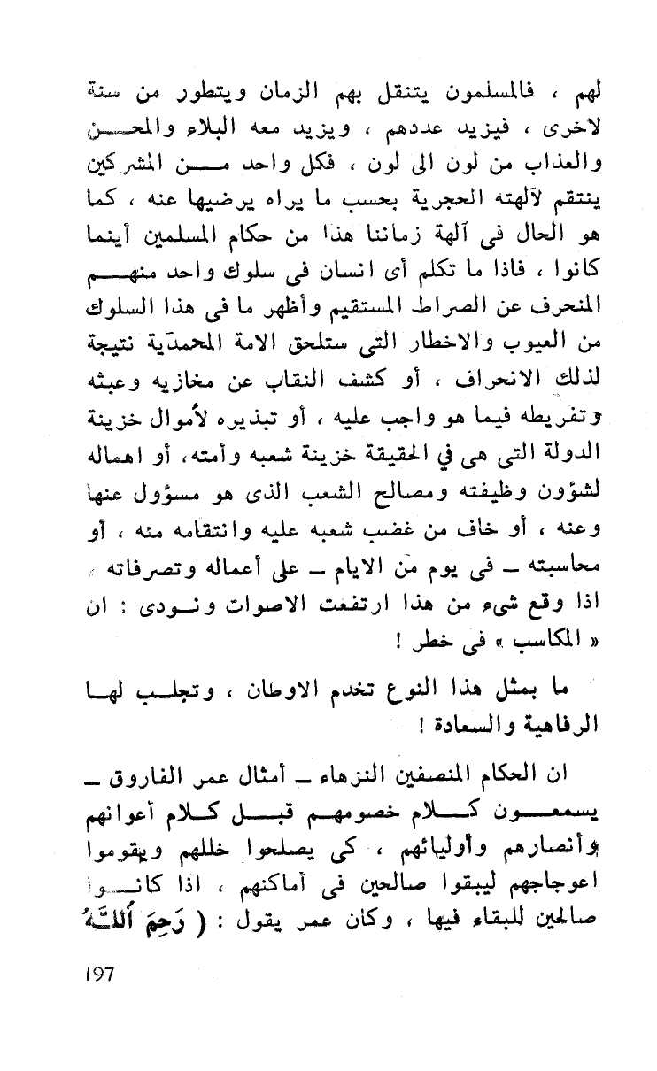 لهم، فالمسلمون يتنقل بهم الزمان ويتطور من سنة لأخرى، فيزيد عددهم، ويزيد معه البلاء والمحن والعذاب من لون إلى لون، فكل واحد من المشركين ينتقم لآلهته الحجرية بحسب ما يراه يرضيها عنه، كما هو الحال في آلهة زماننا هذا من حكام المسلمين أينما كانوا، فإذا ما تكلم أي إنسان في سلوك واحد منهم المنحرف عن الصراط المستقيم وأظهر ما في هذا السلوك من العيوب والأخطار التي ستلحق الأمة المحمدية نتيجة لذلك الانحراف، أو كشف النقاب عن مخازيه وعبثه وتفريطه فيما هو واجب عليه، أو تبذيره لأموال حزينة الدولة التي هي في الحقيقة حزينة شعبه وأمته، أو إهماله لشؤون وظيفته ومصالح الشعب الذي هو مسؤول عنها وعنه، أو خاف من غضب شعبه عليه وانتقامه منه أو محاسبته - في يوم من الأيام - على أعماله وتصرفاته إذا وقع شيء من هذا ارتفعت الأصوات ونودي: أن ((المكاسب)) في خطر!