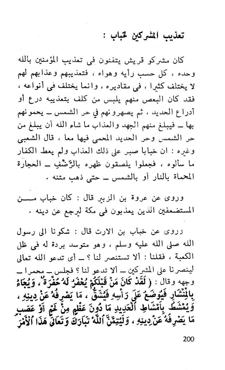 وروى عن خباب بن الأرت قال: شكونا إلى رسول الله صلى الله عليه وسلم، وهو متوسد بردة له في ظل الكعبة، فقلنا: ألا تستنصر لنا؟ - أي تدعو الله تعالى لينصرنا على المشركين - ألا تدعو لنا؟ فجلس - محمرا - وجهه وقال: (لقد كان من قبلكم يحفر له حفرة، ويجاء بالمنشار فيوضع على رأسه فيشق، ما يصرفه عن دينه، ويمشط بأمشاط الحديد ما دون عظم من لحم أو عصب ما يصرفه عن دينه، وليتمن الله تبارك وتعالى هذا الأمر
