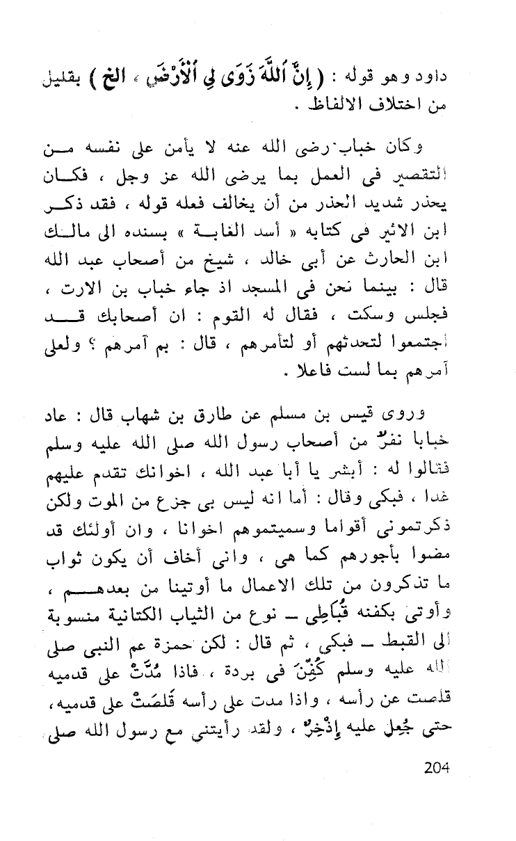 وروى قيس بن مسلم عن طارق بن شهاب قال: عاد خبابا نفر من أصحاب رسول الله صلى الله عليه وسلم فقالوا له: أبشر يا أبا عبد الله، إخوانك تقدم عليهم غدا، فبكى وقال: أما إنه ليس بي جزع من الموت ولكن ذكرتموني أقواما وسميتموهم إخوانا، وأن أولئك قد مضوا بأجورهم كما هي، وإني أخاف أن يكون ثواب ما تذكرون من تلك الأعمال ما أوتينا من بعدهم وأوتى بكفنه قباطي - نوع من الثياب الكتانية منسوبة غلى القبط - فبكى، ثم قال: لكن حمزة عم النبي صلى الله عليه وسلم كفن في بردة، فإذا مدت على قدميه قلصت عن رأسه، وإذا مدت على رأسه قلصت على قدميه، حتى جعل عليه إذخر، ولقد رأيتني مع رسول الله صلى