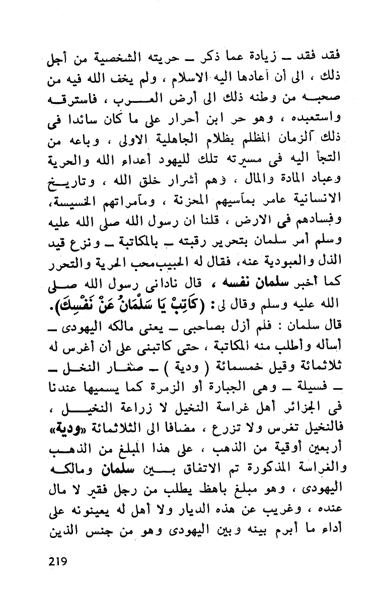 فقد فقد - زيادة عما ذكر - حريته الشخصية من أجل ذلك، إلى أن أعادها إليه الإسلام، ولم يخف الله فيه من صحبه من وطنه ذلك إلى أرض العرب، فاسترقه واستعبده، وهو حر ابن أحرار على ما كان سائدا في ذلك الزمان المظلم بظلام الجاهلية الأولى، وباعه من التجأ إليه في مسيرته تلك لليهود أعداء الله والحرية وعباد المادة والمال، وهم أشرار خلق الله، وتاريخ الإنسانية عامر بمآسيهم المحزنة، ومآمراتهم الخسيسة، وفسادهم في الأرض، قلنا أن رسول الله صلى الله عليه وسلم أمر سلمان بتحرير رقبته - بالمكاتبة - ونزع قيد الذل والعبودية عنه، فقال له الحبيب محب الحرية والتحرر كما أخبر سلمان نفسه، قال ناداني رسول الله صلى الله عليه وسلم وقال لي: (كاتب يا سلمان عن نفسك). قال سلمان: فلم أزل بصاحبي - يعني مالكه اليهودي - أسأله وأطلب منه المكاتبة، حتى كاتبني على أن أغرس له ثلاثمائة وقيل خمسمائة (ودية) - صغار النخل - - فسيلة - وهي الجبارة أو الزمرة كما يسميها عندنا في الجزائر أهل غراسة النخيل لا زراعة النخيل فالنخيل تغرس ولا تزرع، مضافا إلى الثلاثمائة ((ودية)) أربعين أوقية من الذهب، على هذا المبلغ من الذهب والغراسة المذكورة تم الاتفاق بين سلمان ومالكه اليهودي، وهو مبلغ باهظ يطلب من رجل فقير لا مال عنده، وغريب عن هذه الديار ولا أهل له يعينونه على أداء ما أبرم بينه وبين اليهودي وهو من جنس الذين