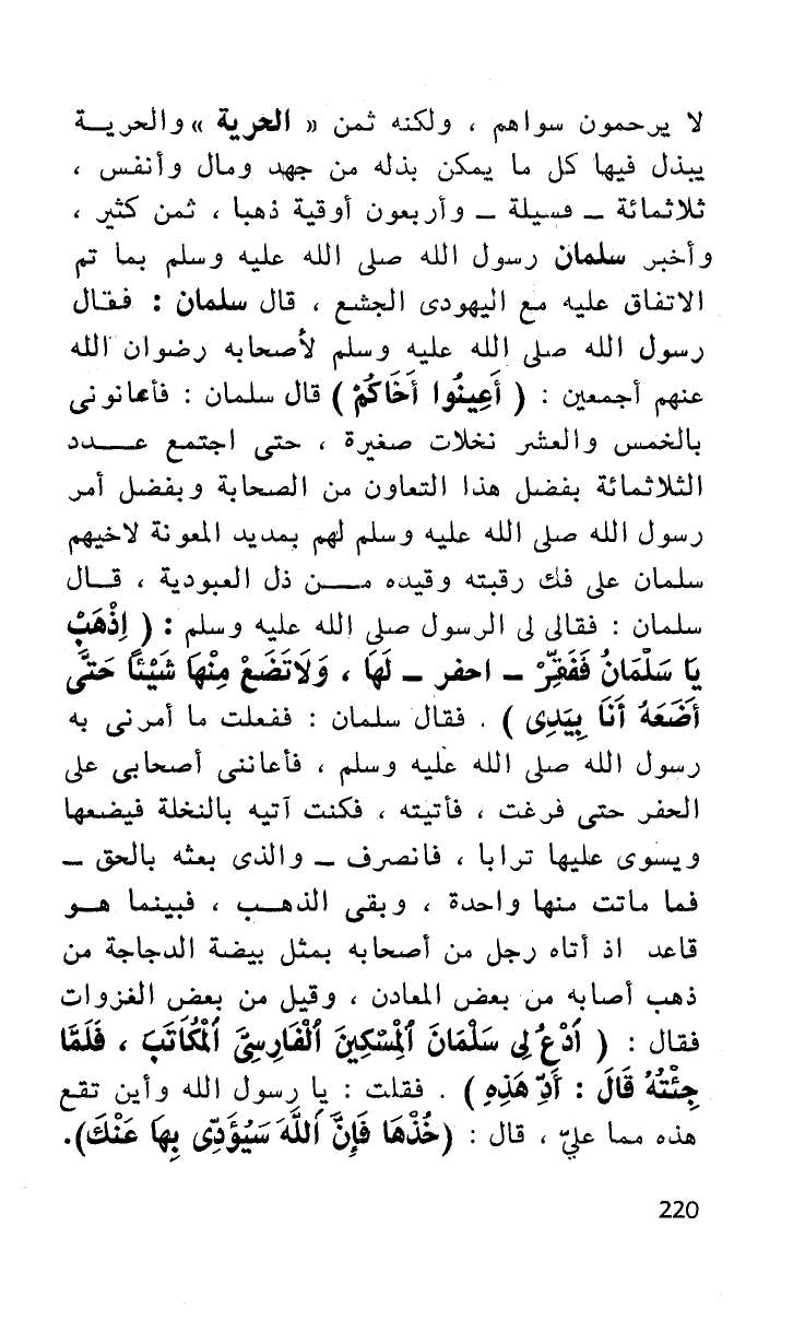 لا يرحمون سواهم، ولكنه ثمن ((الحرية)) والحرية يبذل فيها كل ما يمكن بذله من جهد ومال وأنفس ثلاثمائة - فسيلة - وأربعون أوقية ذهبا، ثمن كثير وأخبر سلمان رسول الله صلى الله عليه وسلم بما تم الاتفاق عليه مع اليهودي الجشع، قال سلمان: فقال رسول الله صلى الله عليه وسلم لأصحابه رضوان الله عنهم أجمعين (أعينوا أخاكم) قال سلمان: فأعانوني بالخمس والعشر نخلات صغيرة، حتى اجتمع عدد الثلاثمائة بفضل هذا التعاون من الصحابة وبفضل أمر رسول الله صلى الله عليه وسلم لهم بمديد المعونة لأخيهم سلمان على فك رقبته وقيده من ذل العبودية قال سلمان: فقال لي الرسول صلى الله عليه وسلم: (اذهب يا سلمان ففقر - احفر - لها، ولا تضع منها شيئا حتى أضعه أنا بيدي) فقال سلمان: ففعلت ما أمرني به رسول الله صلى الله عليه وسلم، فأعانني أصحابي على الحفر حتى فرغت، فأتيته، فكنت آتيه بالنخلة فيضعها ويسوي عليها ترابا، فانصرف - والذي بعثه بالحق - فما ماتت منها واحدة، وبقي الذهب، فبينما هو قاعد إذ أتاه رجل من أصحابه بمثل بيضة الدجاجة من ذهب أصابه من بعض المعادن، وقيل من بعض الغزوات فقال (دع لي سلمان المسكين الفارسي المكاتب، فلما جئته قال: أد هذه) فقات: يا رسول الله وأين تقع هذه مما علي، قال (خذها فإن الله سيؤدي بها عنك).