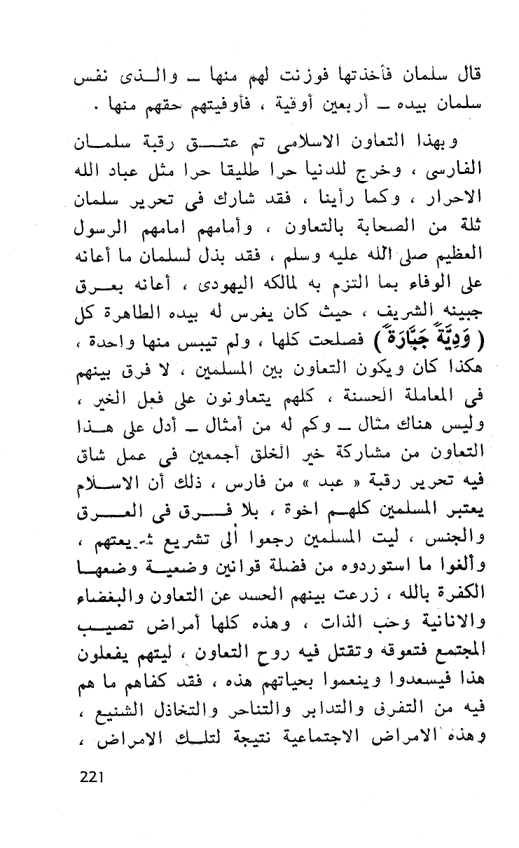 وبهذا التعاون الإسلامي تم عتق رقبة سلمان الفارسي، وخرج للدنيا حرا طليقا حرا مثل عباد الله الأحرار، وكما رأينا، فقد شارك في تحرير سلمان ثلة من الصحابة بالتعاون، وأمامهم إمامهم الرسول العظيم صلى الله عليه وسلم، فقد بذل لسلمان ما أعانه على الوفاء بما التزم به لمالكه اليهودي، أعانه بعرق جبينه الشريف، حيث كان يغرس له بيده الطاهرة كل (ودية جبارة) فصلحت كلها، ولم تيبس منها واحدة هكذا كان ويكون التعاون بين المسلمين، لا فرق بينهم في المعاملة الحسنة، كلهم يتعاونون على فعل الخير وليس هناك مثال - وكم له من أمثال - أدل على هذا التعاون من مشاركة خير الخلق أجمعين في عمل شاق فيه تحرير رقبة ((عبد)) من فارس، ذلك أن الإسلام يعتبر المسلمين كلهم إخوة، بلا فرق في العرق والجنس، ليت المسلمين رجعوا إلى تشريع شريعتهم وألغوا ما استوردوه من فضلة قوانين وضعية وضعها الكفرة بالله، زرعت بينهم الحسد عن التعاون والبغضاء والأنانية وحب الذات، وهذه كلها أمراض تصيب المجتمع فتعوقه وتقتل فيه روح التعاون، ليتهم يفعلون هذا فيسعدوا وينفعوا بحياتهم هذه، فقد كفاهم ما هم فيه من التفرق والتدابر والتناحر والتخاذل الشنيع وهذه الأمراض الاجتماعية نتيجة لتلك الأمراض،