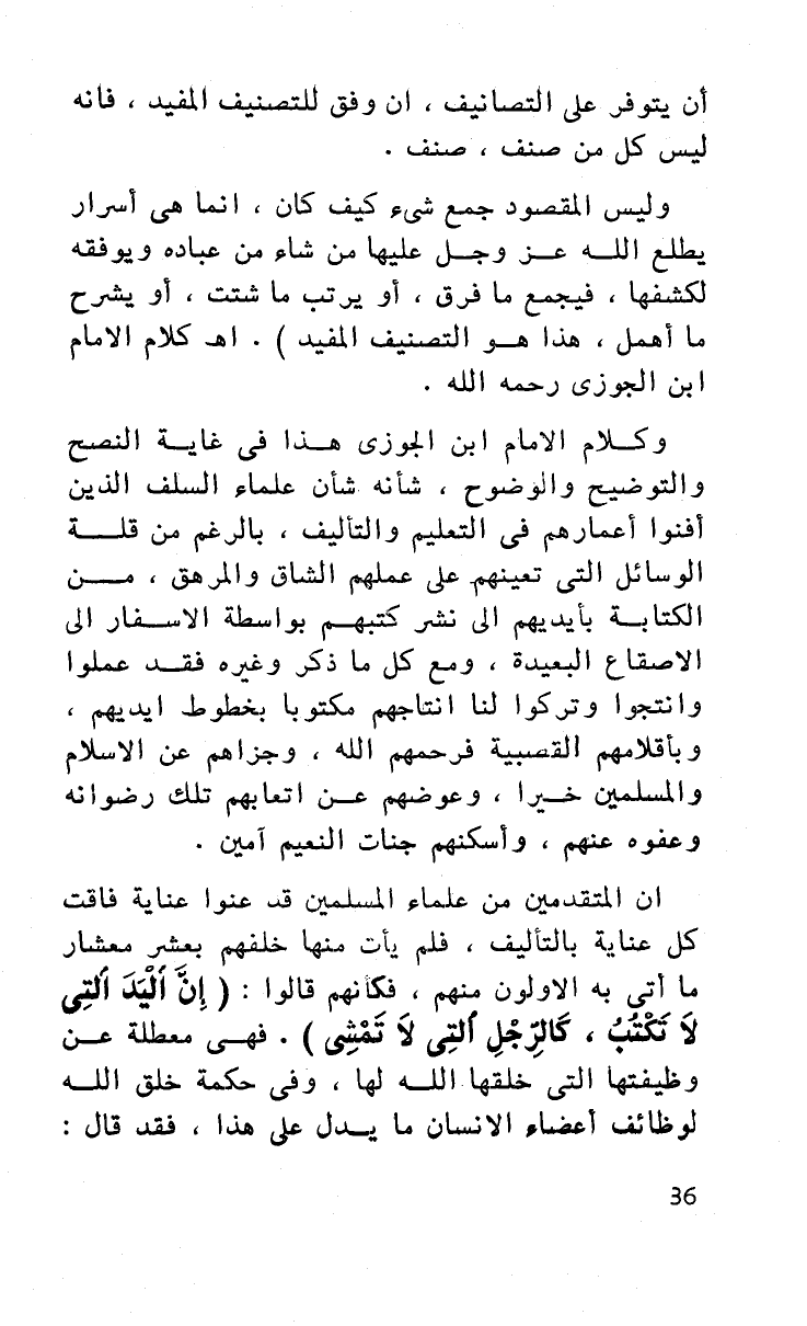 إن المتقدمين من علماء المسلمين قد عنوا عناية فاقت كل عناية بالتأليف فلم يأت منها خلفهم بعشر معشار ما أتي به الأولون منهم، فكأنهم قالوا (إن اليد التي لا تكتب، كالرجل التي لا تمشي). فهي معطلة عن وظيفتها التي خلقها الله لها وفي حكمة خلق الله لوظائف أعضاء الإنسان ما يدل على هذا، فقد قال: