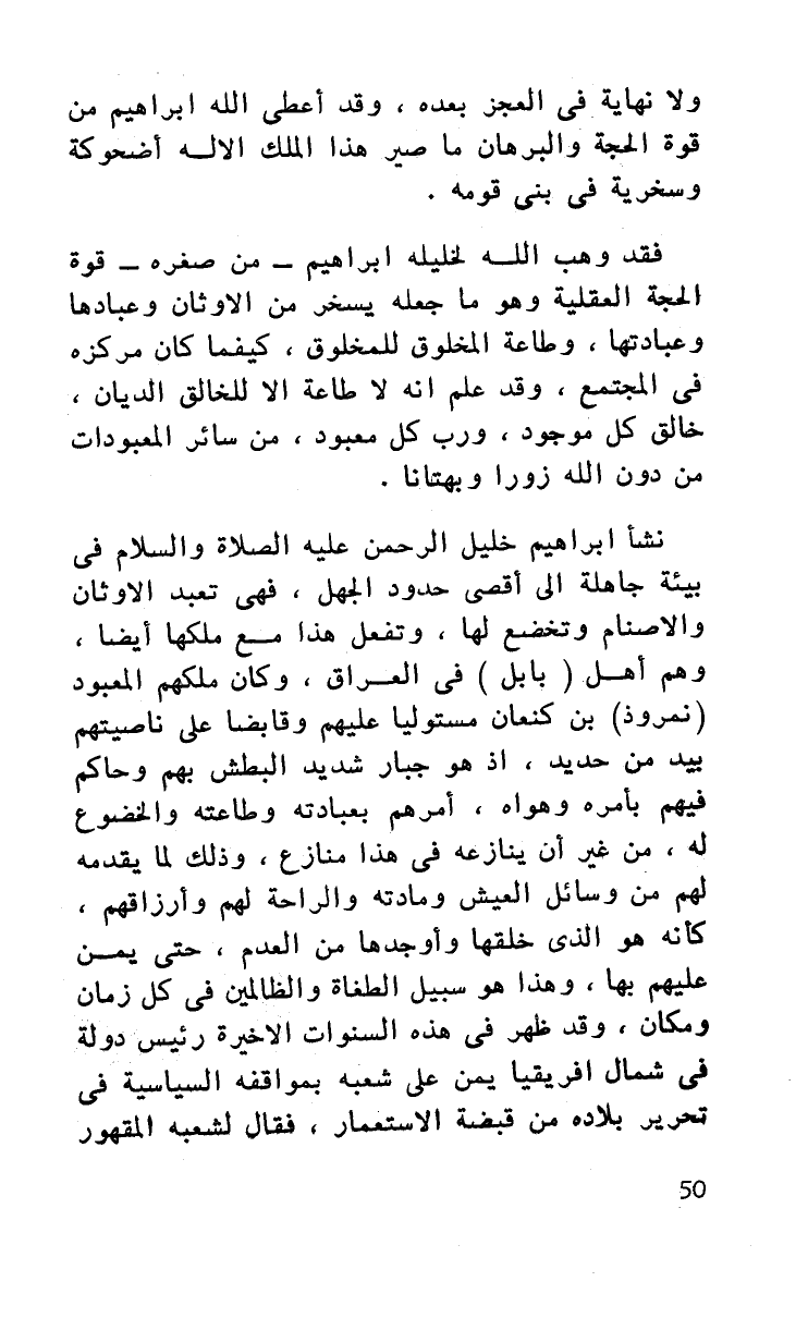 فقد وهب الله لخليله إبراهيم - من صغره - قوة الحجة العقلية وهو ما جعله يسخر من الأوثان وعبادها وعبادتها، وطاعة المخلوق للمخلوق، كيفما كان مركزه في المجتمع وقد علم أنه لا طاعة إلا للخالق الديان خالق كل موجود، ورب كل معبود من سائر المعبودات من دون الله زورا وبهتانا.