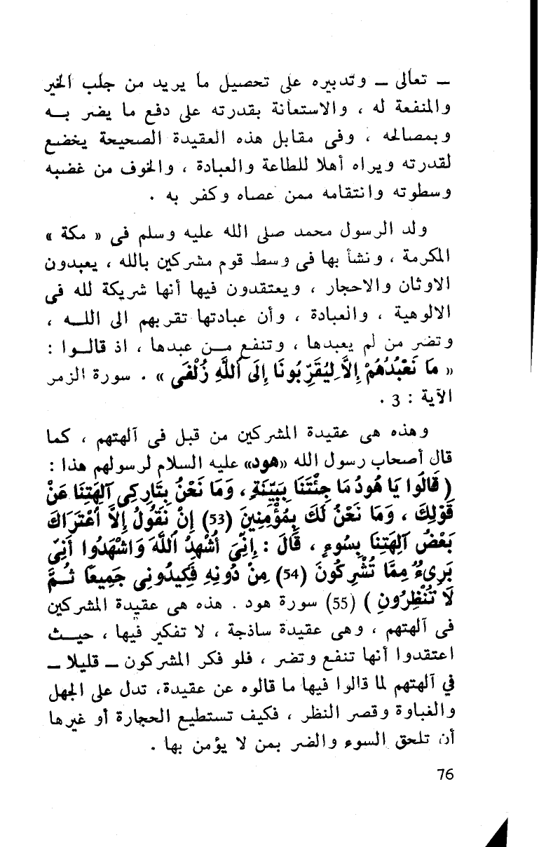 وهذه هي عقيدة المشركين من قبل في آلهتهم، كما قال أصحاب رسول الله ((هود)) عليه السلام رسولهم هذا (قالوا يا هود ما جئتنا ببينة وما نحن بتاركي آلهتنا عن قولك وما نحن (53) ان نقول إلا اعتراك بعض آلهتنا بسوء قال إني أشهد الله واشهدوا أني بريء مما تشركون (54) من دونه فكيدوني جميعا ثم لا تنظرون) (55) سورة هود، هذه هي عقيدة المشركين في آلهتهم وهي عقيدة ساذجة، لا تفكير فيها، حيث اعتقدوا أنها تنفع وتضر، فلو فكر المشركون - قليلا - في آلهتهم لما قالوا فيها ما قالوه عن عقيدة، تدل على الجهل والغباوة وقصر النظر فكيف تستطيع الحجارة أو غيرها أن، تلحق السوء والضر بمن لا يؤمن بها.