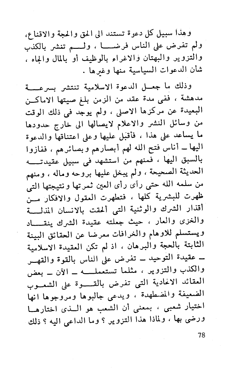 وهذا سبيل كل دعوة تستند إلى الحق والحجة والإقناع، ولم تفرض على الناس فرضا، ولم تنشر بالكذب والتزوير والبهتان والإغراء بالوظيف أو بالمال والجاه شأن الدعوات السياسية منها وغيرها.