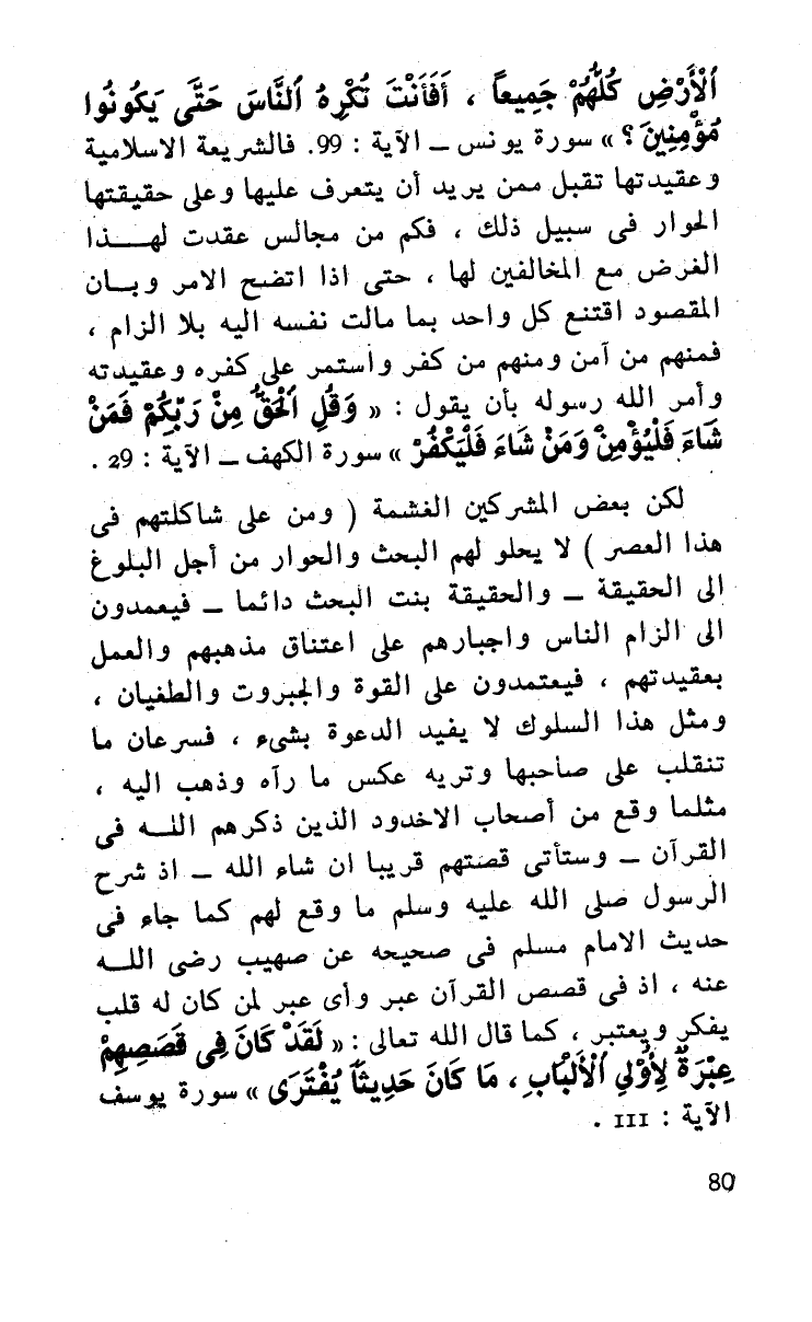 الأرض كلهم جميعا أفأنت تكره الناس حتى يكونوا مؤمنين)) سورة يونس - الآية 99. فالشريعة الإسلامية وعقيدتها تقبل ممن يريد أن يتعرف عليها وعلى حقيقتها الحوار في سبيل ذلك، فكم من مجالس عقدت لهذا الغرض مع المخالفين لها، حتى إذا اتضح الأمر وبان المقصود اقتنع كل واحد بما مالت نفسه إليه بلا إلزام فمنهم من آمن ومنهم من كفر واستمر على كفره وعقيدته وأمر الله رسوله بأن يقول ((وقل الحق من ربكم فمن شاء فليؤمن ومن شاء فليكفر)) سوره الكهف - الآية 29.
