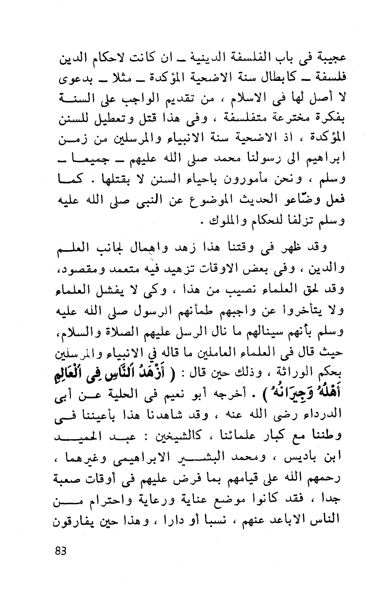 عجيبة في باب الفلسفة الدينية - إن كانت لأحكام الدين فلسفة - كإبطال سنة الأضحية المؤكدة - مثلا - بدعوى لا أصل لها في الإسلام من تقديم الواجب على السنة بفكرة مخترعة متفلسفة وفي هذا قتل وتعطيل للسنن المؤكدة إذ الأضحية سنة الأنبياء والمرسلين من زمن إبراهيم إلى رسولنا محمد صلى الله عليهم - جميعا - وسلم ونحن مأمورون بإحياء السنن لا بقتلها كما فعل وضاعو الحديث الموضوع عن النبي صلى الله عليه وسلم تزلفا للحكام والملوك.