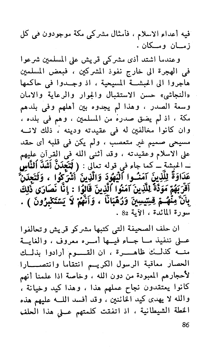وعندما اشتد أذى مشركي قريش على المسلمين شرعوا في الهجرة إلى خارج نفوذ المشركين فبعض المسلمين هاجروا إلى الحبشة المسيحية، إذ وجدوا في حاكمها ((النجاشي)) حسن الاستقبال والجوار والرعاية والأمان وسعة الصدر، وهذا لم يجدوه بين أهلهم وفي بلدهم مكة، إذ لم يضق صدره من المسلمين وهم في بلده وإن كانوا مخالفين له في عقيدته ودينه ذلك لأنه مسيحي صميم غير متعصب، ولم يكن في قلبه أي حقد على الإسلام وعقيدته وقد أثنى الله في القرآن عليهم - الحبشة - كما جاء في قوله تعالى: (لتجدن أشد الناس عداوة للذين آمنوا اليهود والذين أشركوا ولتجدن أقربهم مودة للذين آمنوا الذين قالوا: إنا نصارى ذلك بأن منهم قسيسين ورهبانا وأنهم لا يستكبرون). سورة المائدة، الآية 82.