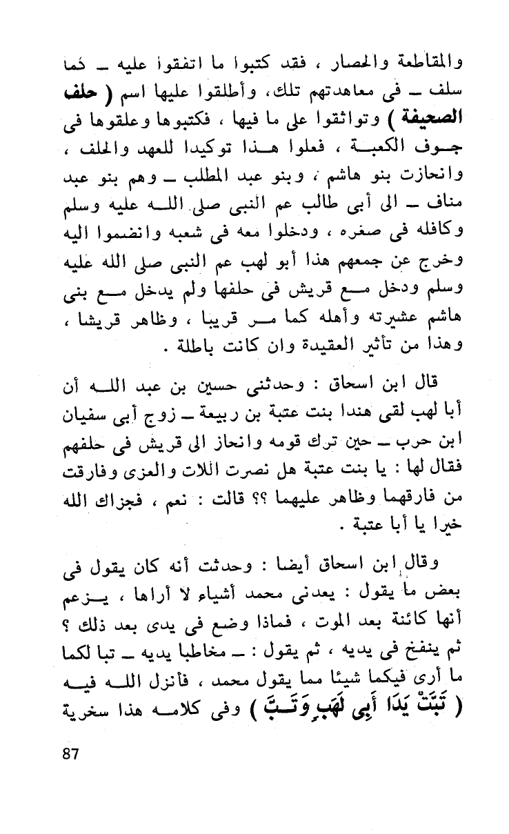 وقال ابن إسحاق أيضا، وحدثت أنه كان يقول في بعض ما يقول يعدنى محمد أشياء لا أراها، يزعم أنها كائنة بعد الموت، فماذا وضع في يدي بعد ذلك؟ ثم ينفخ في يديه ثم يقول - مخاطبا يديه - تبا لكما ما أرى فيكما شيئا مما يقول محمد، فأنزل الله فيه (تبت يدا أبي لهب وتب) وفي كلامه هذا سخرية