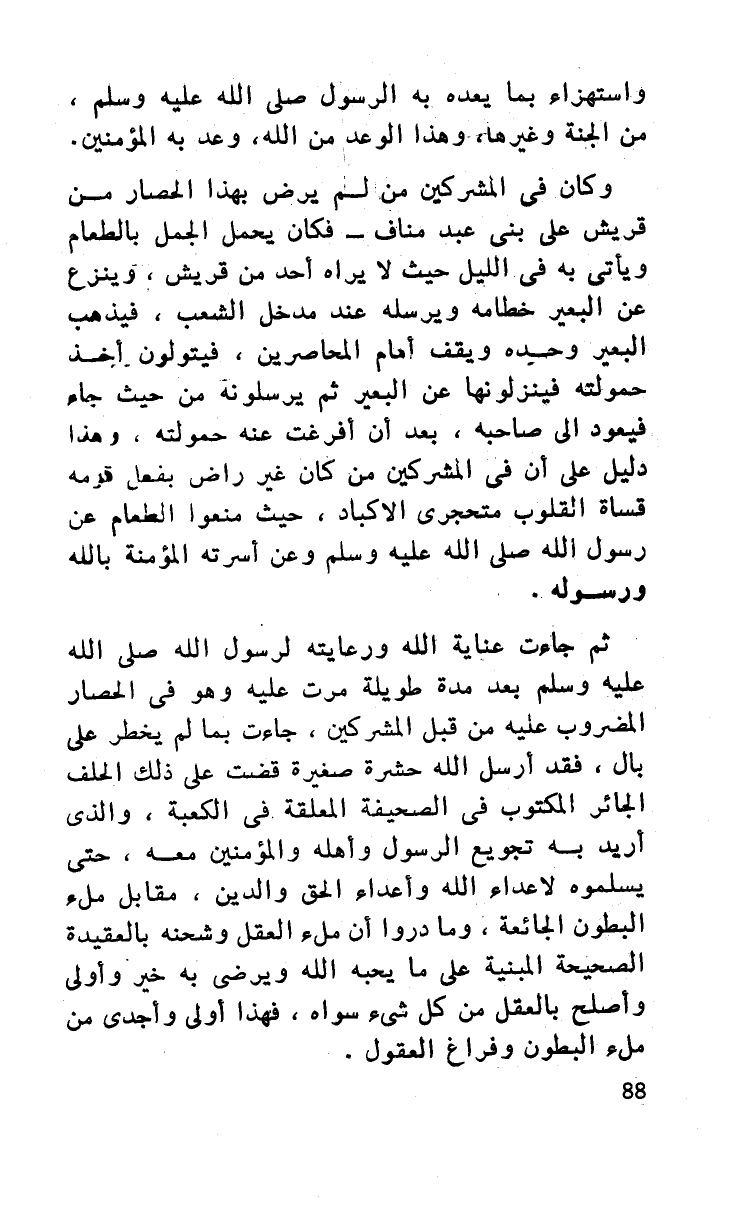 وكان في المشركين من لم يرض بهذا الحصار من قريش على بني عبد مناف فكان يحمل الجمل بالطعام ويأتي به في الليل حيث لا يراه أحد من قريش، وينزع عن البعير خطامه ويرسله عند مدخل الشعب فيذهب البعير وحده ويقف أمام المحاصرين فيقولون أخذ حمولته فينزلونها عن البعير ثم يرسلونه من حيث جاء فيعود إلى صاحبه، بعد أن أفرغت عنه حمولته وهذا دليل على أن في المشركين من كان غير راض بفعل قومه قساة القلوب متحجري الأكباد حيث منعوا الطعام عن رسول الله صلى الله عليه وسلم وعن أسرته المؤمنة بالله ورسوله.