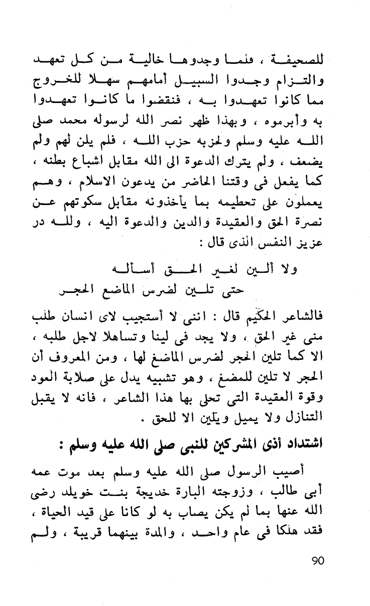 للصحيفة فلما وجدوها خالية من كل تعهد والتزام وجدوا السبيل أمامهم سهلا للخروج مما كانوا تعهدوا به، فنقضوا ما كانوا تعهدوا به وأبرموه، وبهذا ظهر نصر الله لرسوله محمد صلى الله عليه وسلم ولحزبه حزب الله فلم يلن لهم ولم يضعف، ولم يترك الدعوة إلى الله مقابل إشباع بطنه كما يفعل في وقتنا الحاضر من يدعون الإسلام، وهم يعملون على تحطيمه بما يأخذونه مقابل سكوتهم عن نصرة الحق والعقيدة والدين والدعوة إليه ولله در عزيز النفس الذي قال: