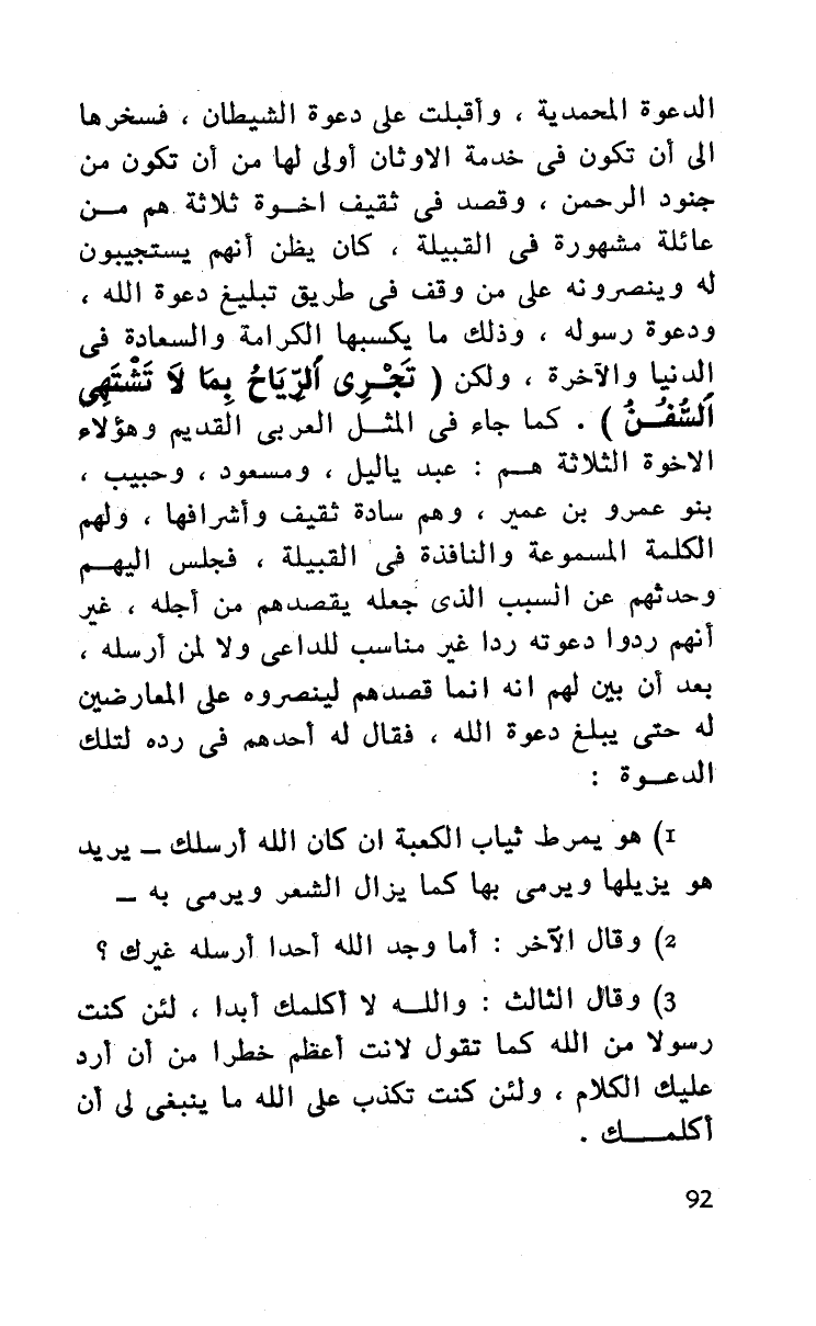 الدعوة المحمدية، وأقبلت على دعوة الشيطان، فسخرها إلى أن تكون في خدمة الأوثان أولى لها من أن تكون من جنود الرحمن، وقصد في ثقيف إخوة ثلاثة هم من عائلة مشهورة في القبيلة كان يظن أنهم يستجيبون له وينصرونه على من وقف في طريق تبليغ دعوة الله، ودعوة رسوله وذلك ما يكسبها الكرامة والسعادة في الدنيا والآخرة، ولكن (تجرى الرياح بما لا تشتهي السفن)، كما جاء في المثل العربي القديم وهؤلاء الإخوة الثلاثة هم عبد ياليل ومسعود، وحبيب بنو عمرو بن عمير، وهم سادة ثقيف وأشرافها، ولهم الكلمة المسموعة والنافذة في القبيلة فجلس إليهم وحدثهم عن السبب الذي جعله يقصدهم من أجله غير أنهم ردوا دعوته ردا غير مناسب للداعي ولا لمن أرسله بعد أن بين لهم أنه إنما قصدهم لينصروه على المعارضين له حتى يبلغ دعوة الله، فقال له أحدهم في رده لتلك الدعوة: