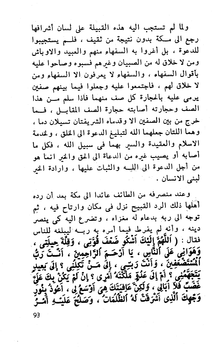 ولما لم تستجب إليه هذه القبيلة على لسان أشرافها رجع إلى مكة بدون نتيجة من ثقيف فلم يستجيبوا للدعوة بل أغروا به السفهاء منهم والعبيد والأوباش ومن لا خلاق له من الصبيان وغيرهم فسبوه وصاحوا عليه بأقوال السفهاء، والسفهاء لا يعرفون إلا السفهاء ومن لا خلاق لهم، فاجتمعوا عليه وجعلوا فيما بينهم صفين يرمي عليه بالحجارة كل صف منهما فإذا سلم من هذا الصف وحجارته، أصابته حجارة الصف المقابل فما خرج من بين الصفين إلا وقدماه الشريفتان تسيلان دما، وهما اللتان جعلهما الله لتبليغ الدعوة إلى الخلق، ولخدمة الإسلام والعقيدة والسير بهما في سبيل الله، فكل ما أصابه أو يصيب غيره من الدعاة إلى الحق والخير إنما هو من أجل الدعوة إلى الله والثبات عليها، وإرادة الخير لبني الإنسان.
