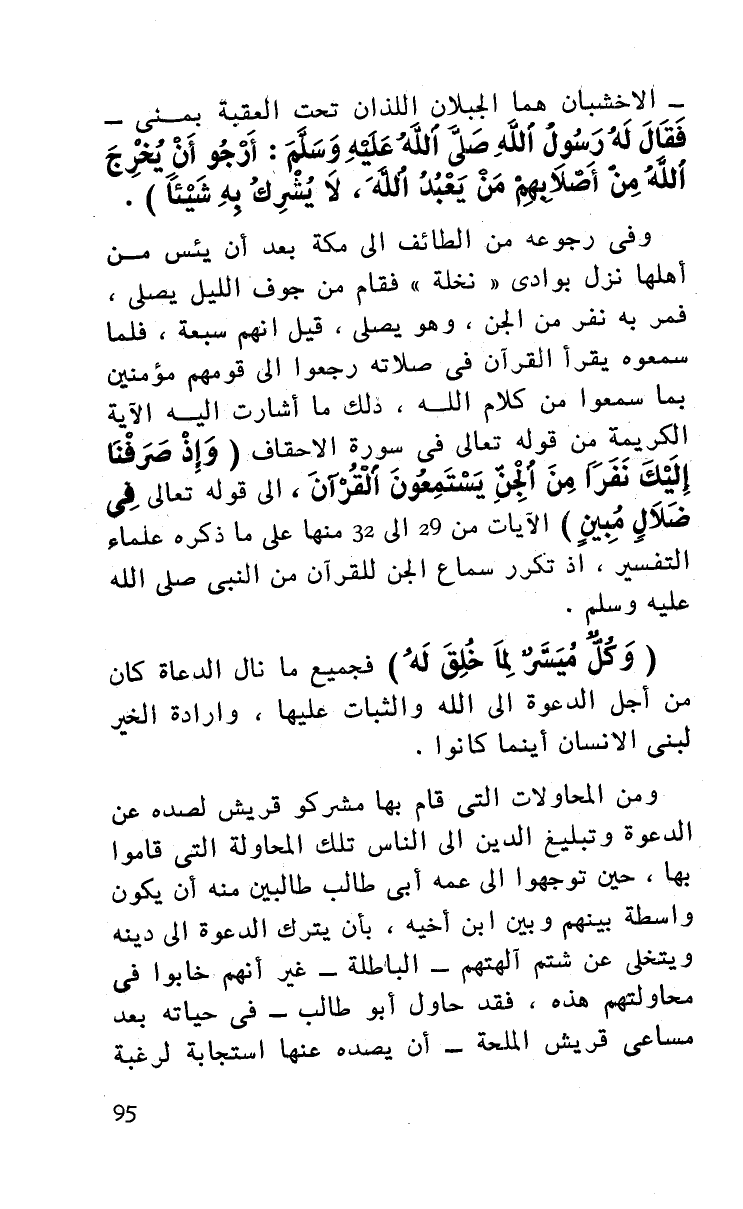 وفي رجوعه من الطائف إلى مكة بعد أن يئس من أهلها نزل بوادي ((نخلة)) فقام من جوف الليل يصلي فمر به نفر من الجن، وهو يصلي، قيل أنهم سبعة، فلما سمعوه يقرأ القرآن في صلاته رجعوا إلى قومهم مؤمنين بما سمعوا من كلام الله، ذلك ما أشارت إليه الآية الكريمة من قولي تعالى في سورة الأحقاف: (وإذ صرفنا إليك نفرا من الجن يستمعون القرآن) إلى قوله تعالى: (في ضلال مبين) الآيات من 29 إلى 32 منها على ما ذكره علماء التفسير، إذ تكرر سماع الجن للقرآن من النبي صلى الله عليه وسلم.