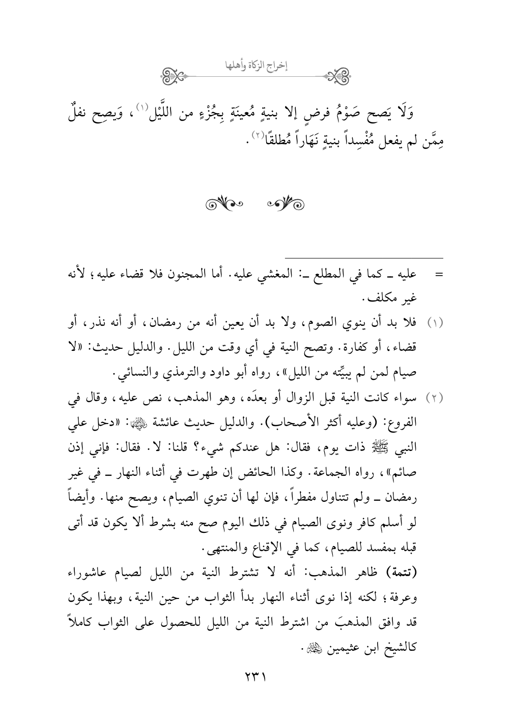 (تتمة) ظاهر المذهب: أنه لا تشترط النية من الليل لصيام عاشوراء وعرفة؛ لكنه إذا نوى أثناء النهار بدأ الثواب من حين النية، وبهذا يكون قد وافق المذهبَ من اشترط النية من الليل للحصول على الثواب كاملاً كالشيخ ابن عثيمين رحمه الله.