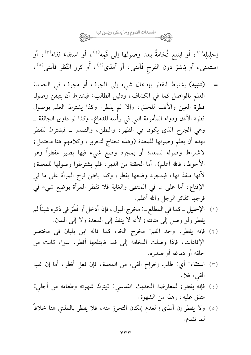 (¬١) الإحليل - كما في المطلع -: مخرج البول، فإذا أدخل أو قَطَرَ في ذكره شيئاً لم يفطر ولو وصل إلى مثانته؛ لأنه لا ينفذ إلى المعدة ولا إلى البدن.