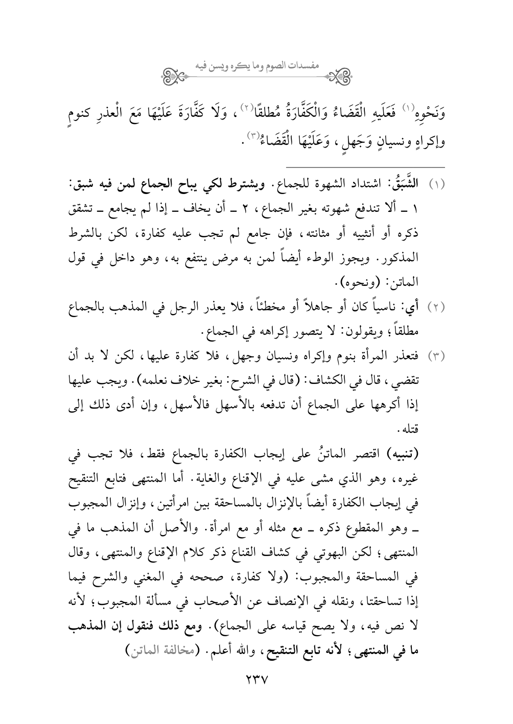 (¬١) الشَّبَقُ: اشتداد الشهوة للجماع. ويشترط لكي يباح الجماع لمن فيه شبق: ١ - ألا تندفع شهوته بغير الجماع، ٢ - أن يخاف - إذا لم يجامع - تشقق ذكره أو أنثييه أو مثانته، فإن جامع لم تجب عليه كفارة، لكن بالشرط المذكور. ويجوز الوطء أيضاً لمن به مرض ينتفع به، وهو داخل في قول الماتن: (ونحوه).