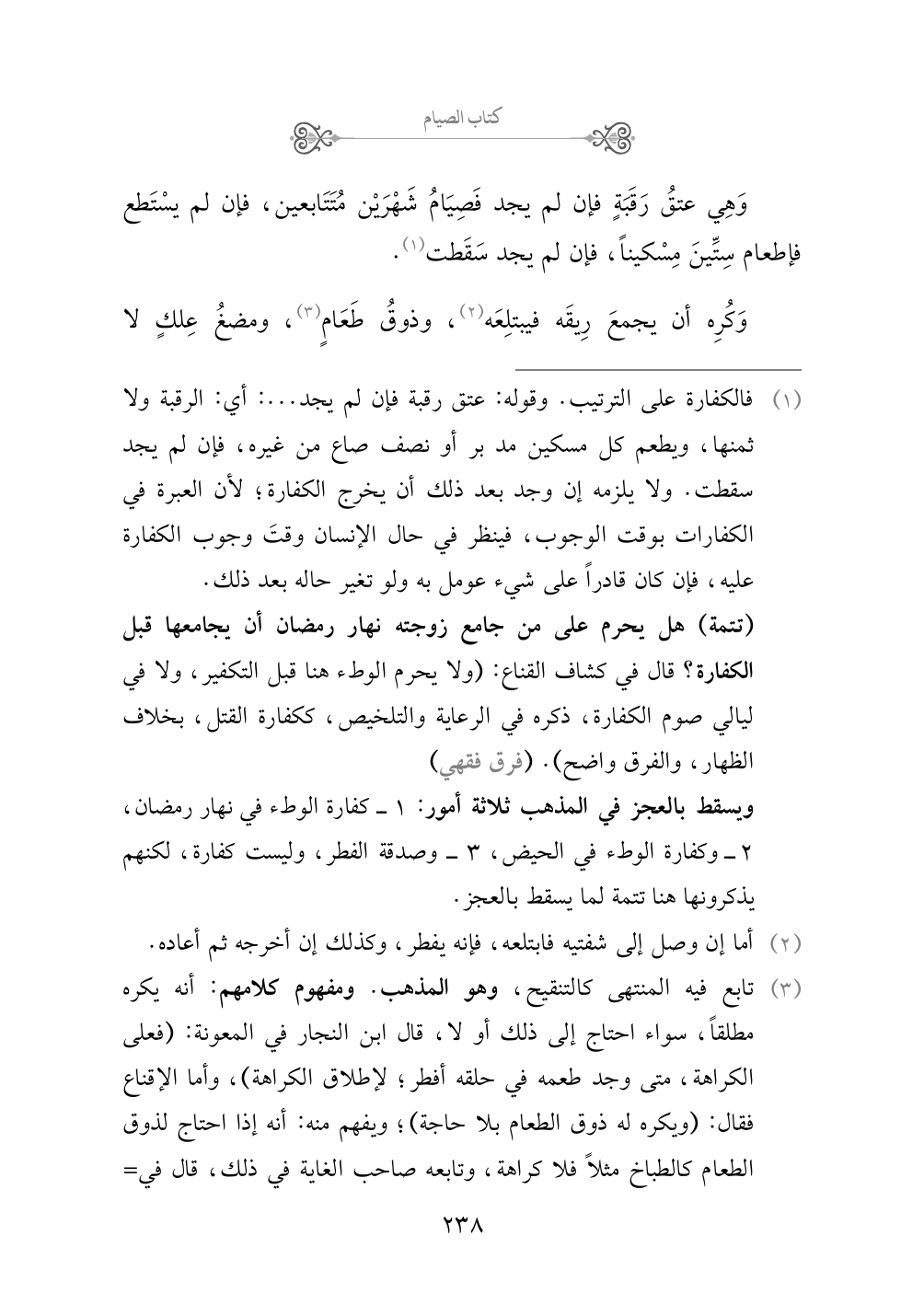 (¬١) فالكفارة على الترتيب. وقوله: عتق رقبة فإن لم يجد ... : أي: الرقبة ولا ثمنها، ويطعم كل مسكين مد بر أو نصف صاع من غيره، فإن لم يجد سقطت. ولا يلزمه إن وجد بعد ذلك أن يخرج الكفارة؛ لأن العبرة في الكفارات بوقت الوجوب، فينظر في حال الإنسان وقتَ وجوب الكفارة عليه، فإن كان قادراً على شيء عومل به ولو تغير حاله بعد ذلك.
