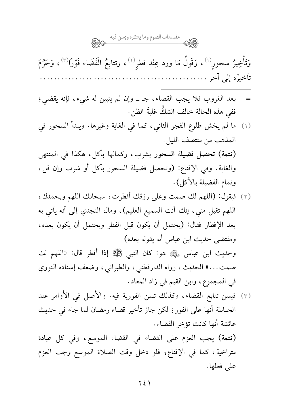 وَتَأْخِيرُ سحورٍ (¬١)، وَقَولُ مَا ورد عِنْد فطرٍ (¬٢)، وتتابعُ الْقَضَاء فَوْرًا (¬٣)، وَحَرُمَ تأخيرُه إلى آخر