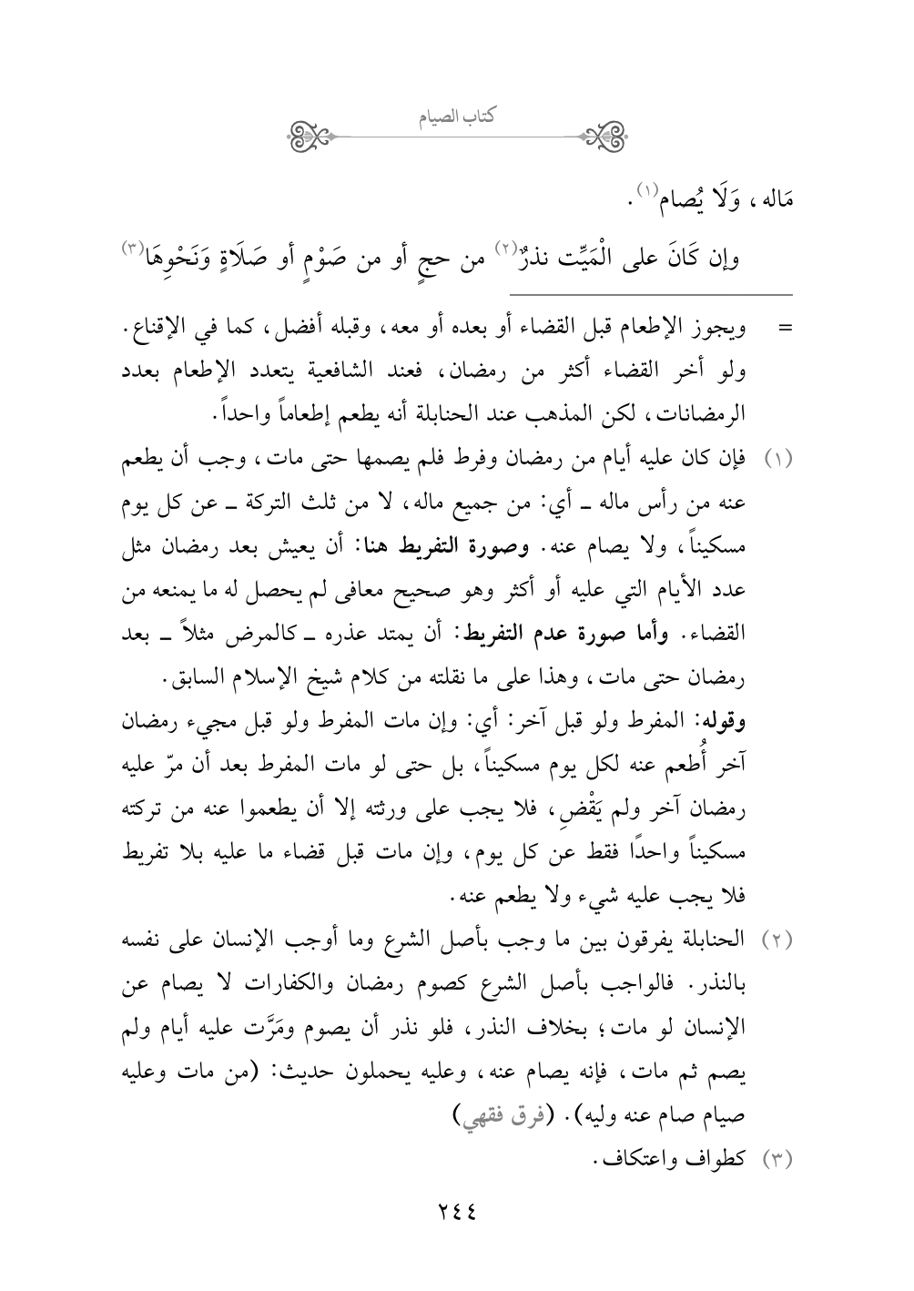 (¬١) فإن كان عليه أيام من رمضان وفرط فلم يصمها حتى مات، وجب أن يطعم عنه من رأس ماله - أي: من جميع ماله، لا من ثلث التركة - عن كل يوم مسكيناً، ولا يصام عنه. وصورة التفريط هنا: أن يعيش بعد رمضان مثل عدد الأيام التي عليه أو أكثر وهو صحيح معافى لم يحصل له ما يمنعه من القضاء. وأما صورة عدم التفريط: أن يمتد عذره - كالمرض مثلاً - بعد رمضان حتى مات، وهذا على ما نقلته من كلام شيخ الإسلام السابق.