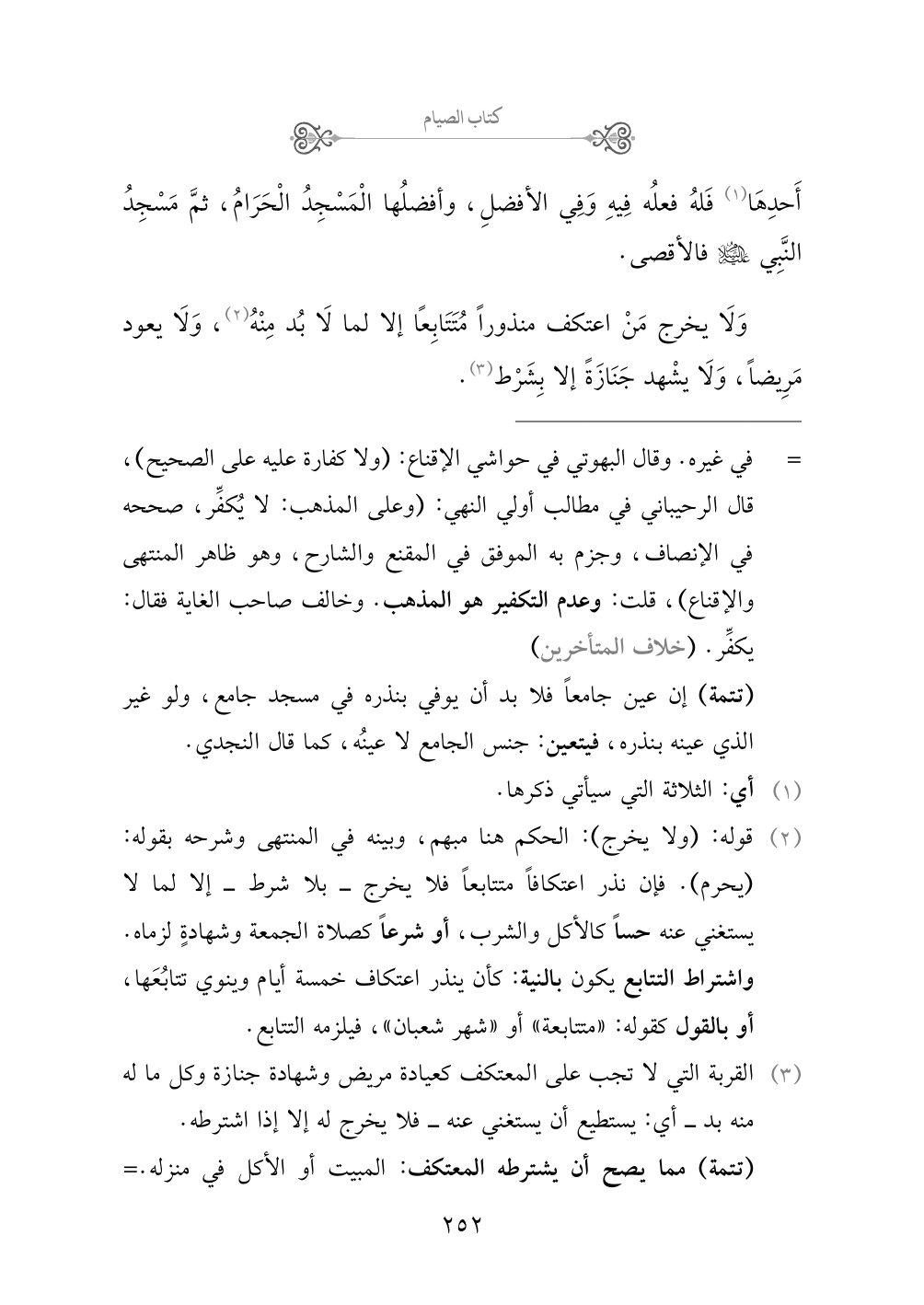 (¬٢) قوله: (ولا يخرج): الحكم هنا مبهم، وبينه في المنتهى وشرحه بقوله: (يحرم). فإن نذر اعتكافاً متتابعاً فلا يخرج - بلا شرط - إلا لما لا يستغني عنه حساً كالأكل والشرب، أو شرعاً كصلاة الجمعة وشهادةٍ لزماه. واشتراط التتابع يكون بالنية: كأن ينذر اعتكاف خمسة أيام وينوي تتابُعَها، أو بالقول كقوله: «متتابعة» أو «شهر شعبان»، فيلزمه التتابع.
